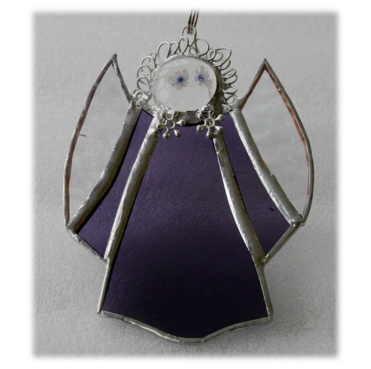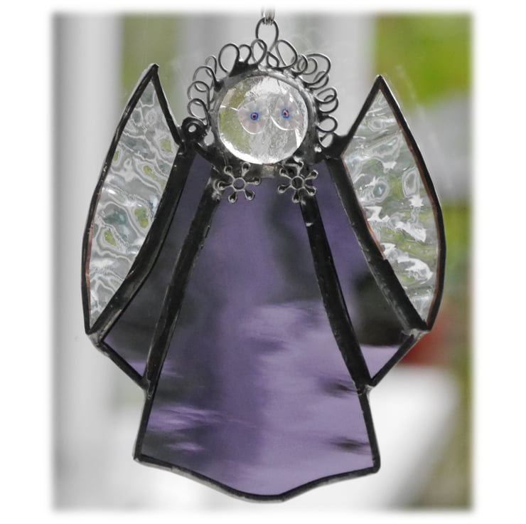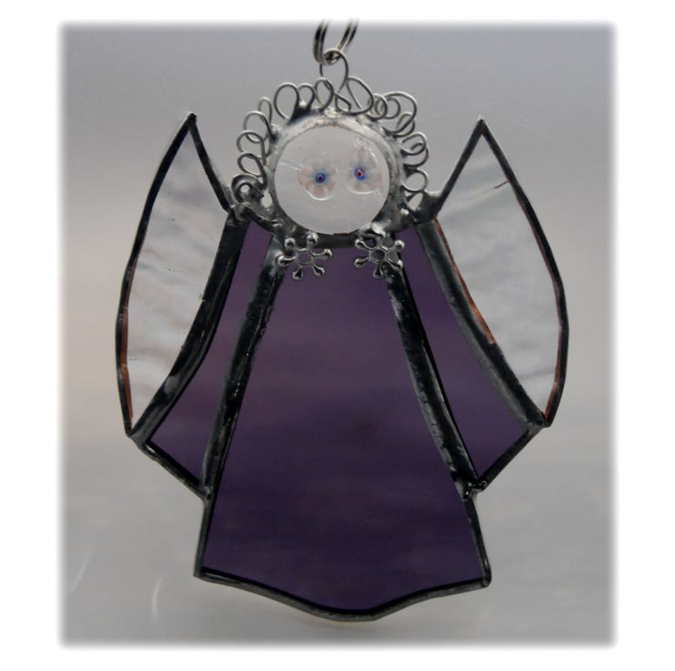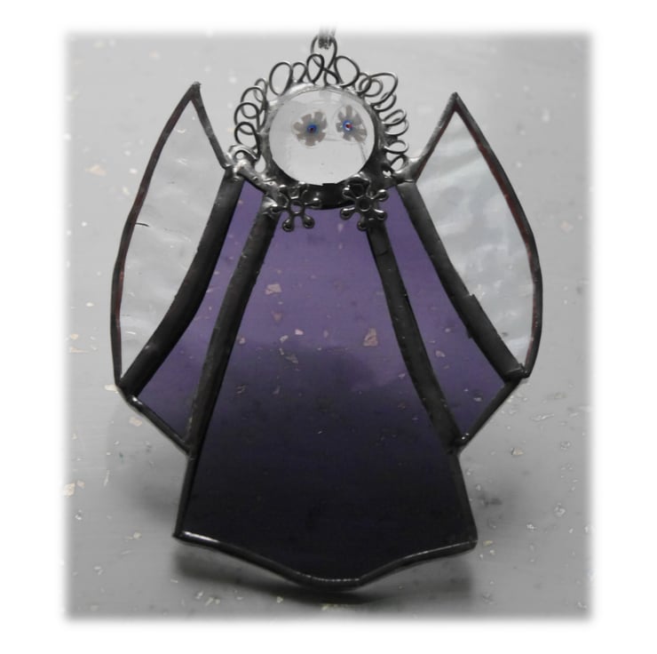 This is a stained glass suncatcher, an angel, made using the Tiffany copper foil technique.