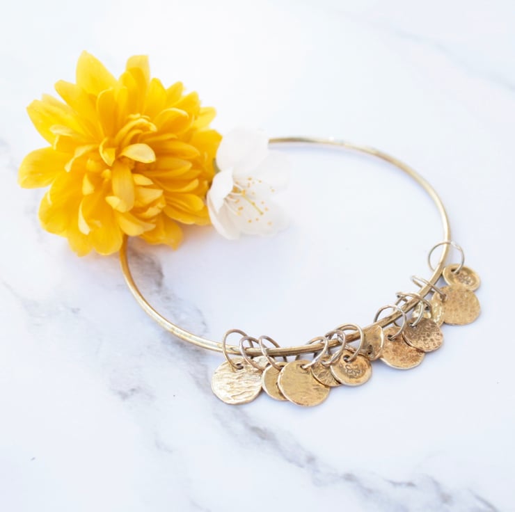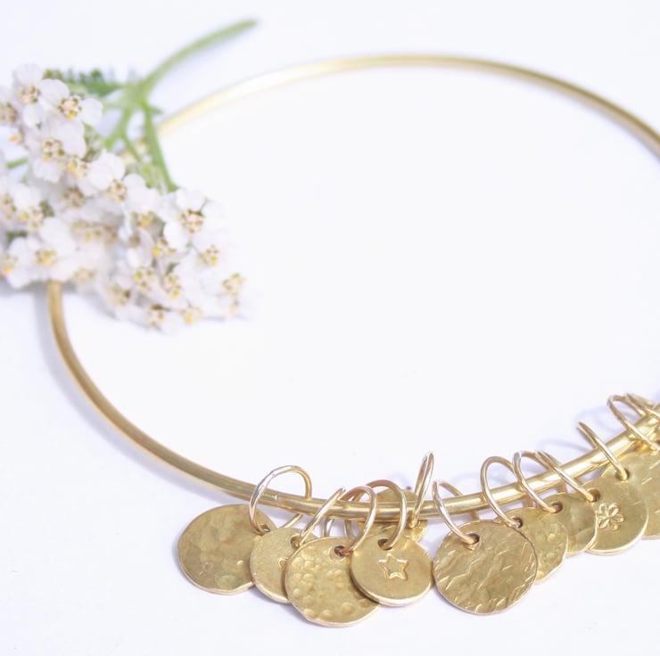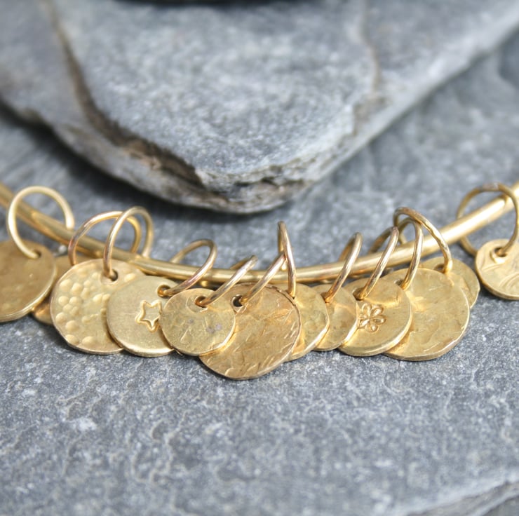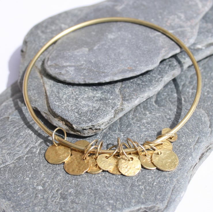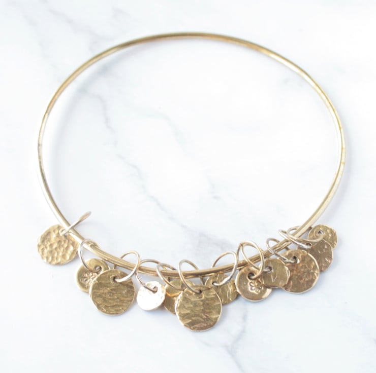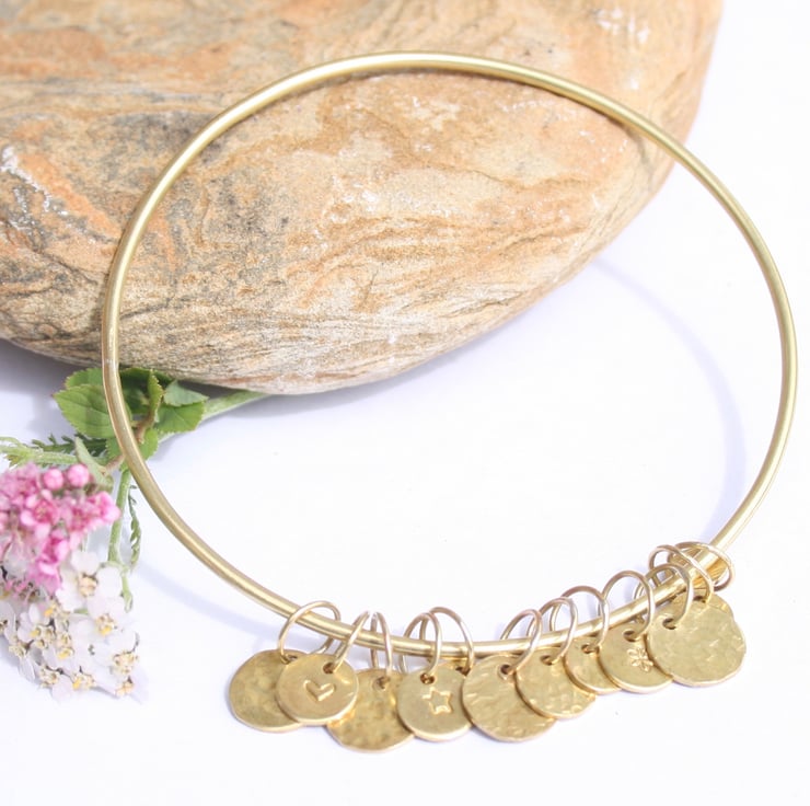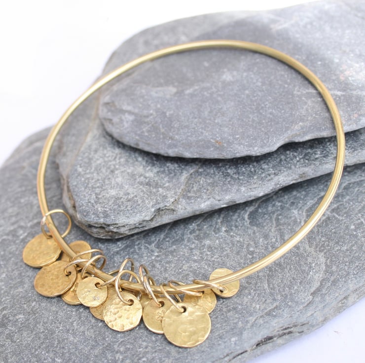 This solid brass bangle has 12 textured charms which move freely as you wear it and this makes a lovely gentle sound.