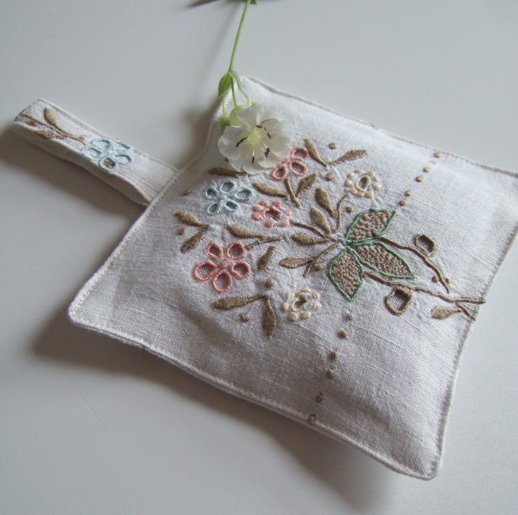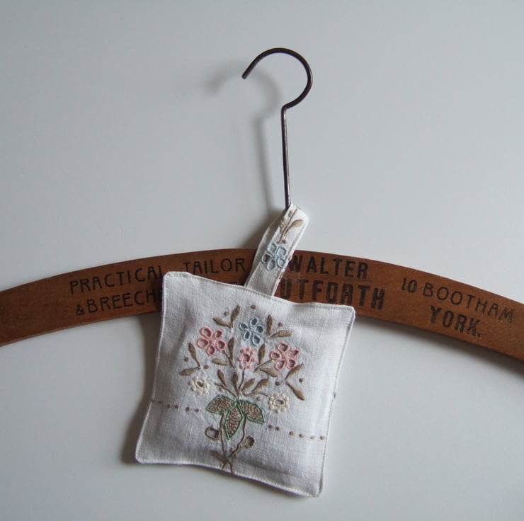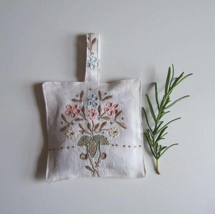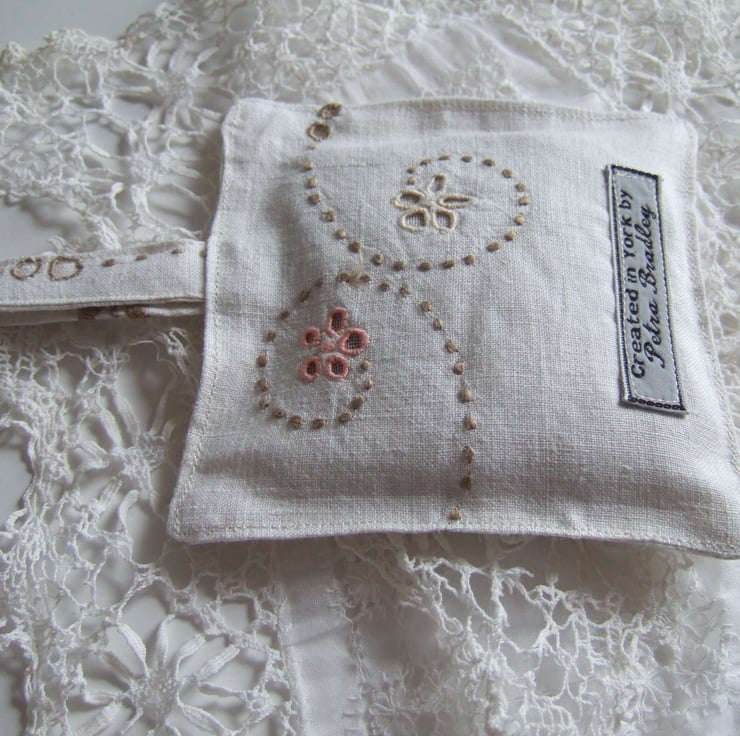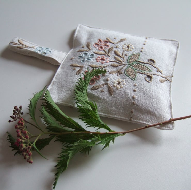 It is snuggled inside an outer cover of vintage embroidered cotton, and has a different design front and back. The flowers are cut back, which means there are little edged holes in them, allowing the scent to circulate out freely.