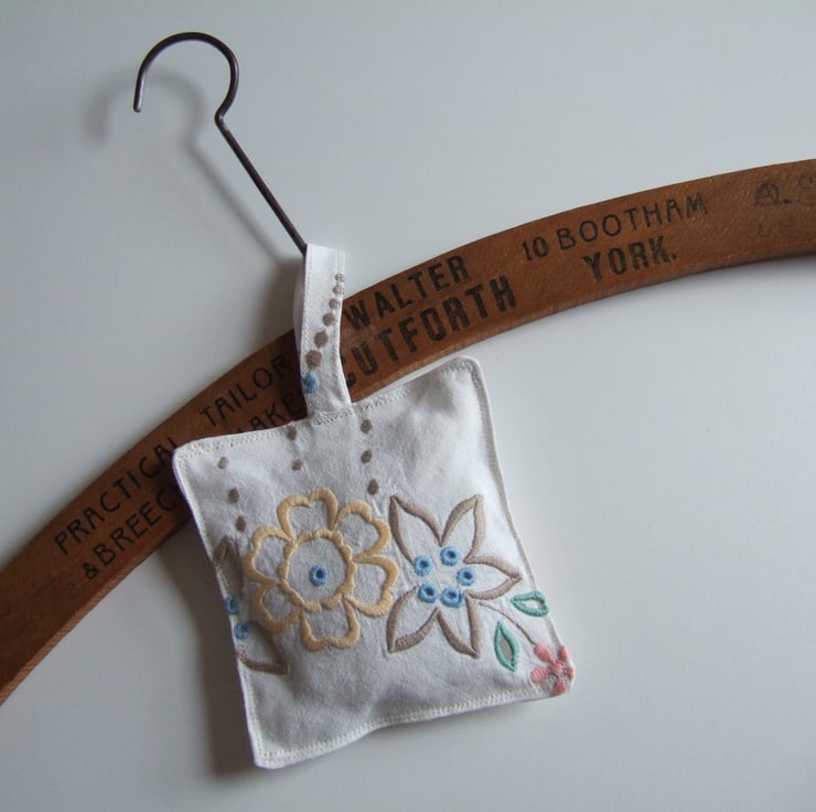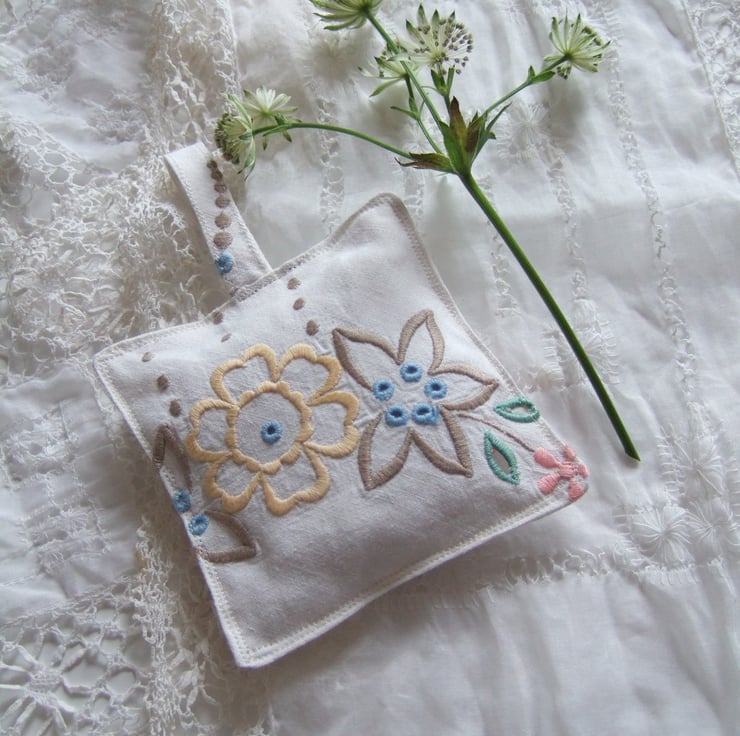 It is made from a piece of vintage table linen, washed and faded, embroidered with flowers.There are little oversewn holes in the design, which allows the aroma to circulate easily.