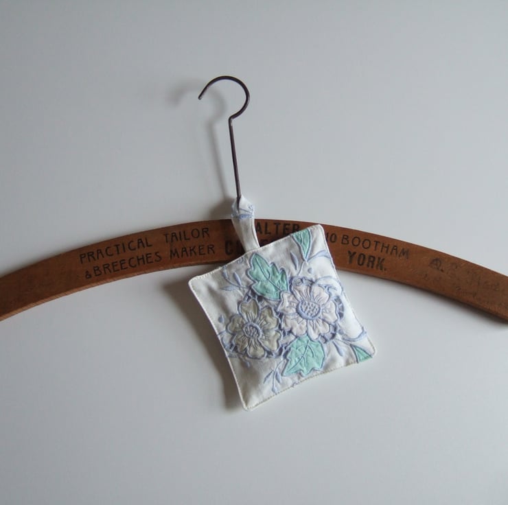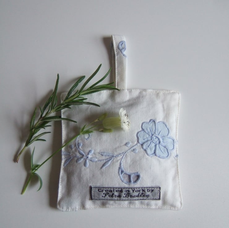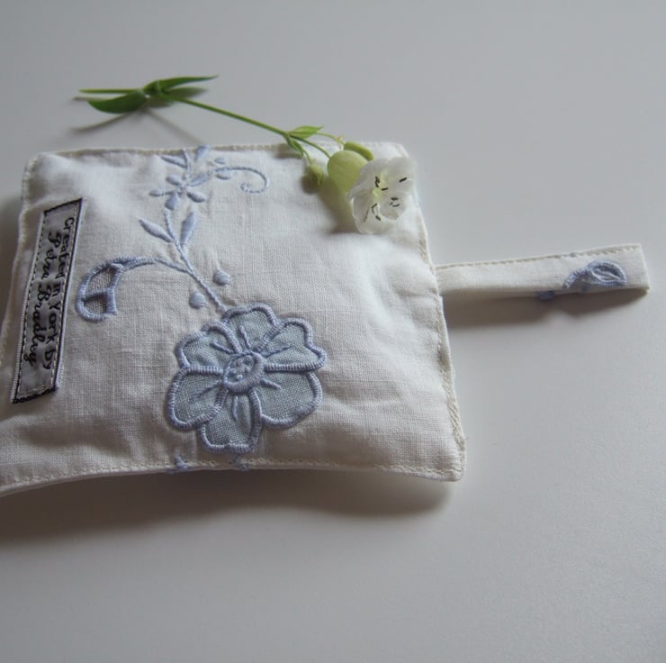 This little bag is made from an old machine embroidered table cloth. Safe inside, is a tiny muslim pillow of Derbyshire lavender.