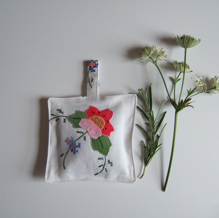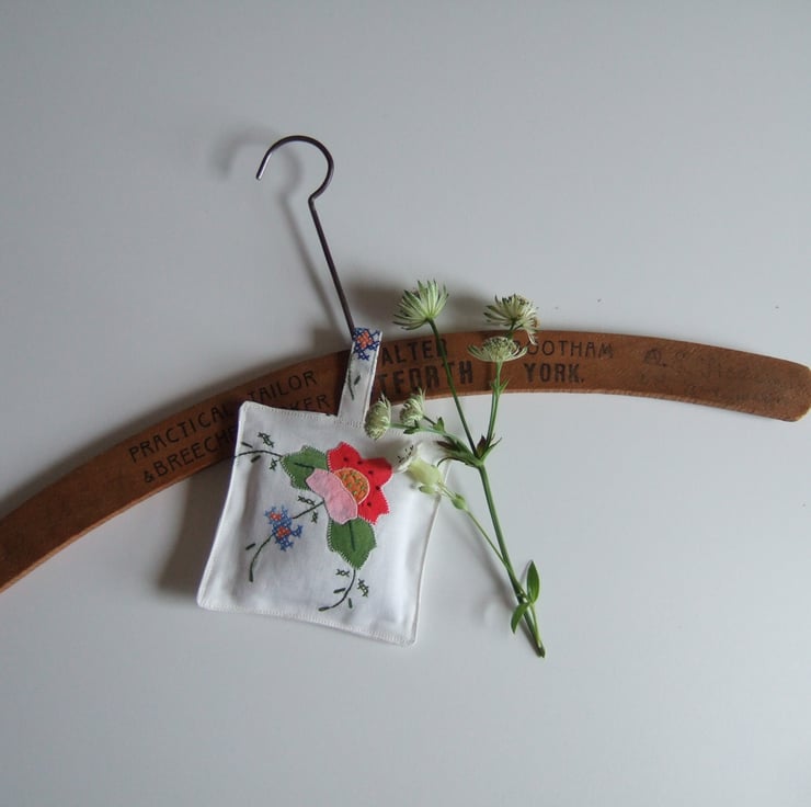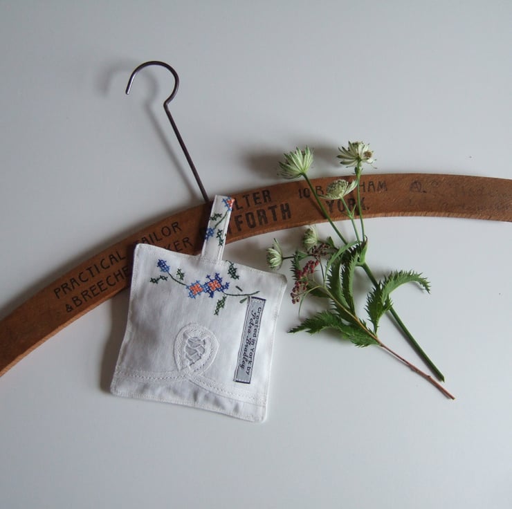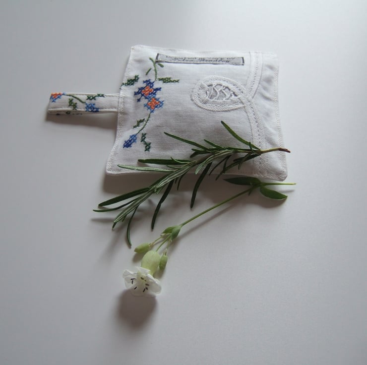Some gorgeous hand embroidered and appliqued vintage fabric make this a very pretty lavender bag indeed. There is a little lace lined cut away to the back, which allows the scent to waft out, which has been claimed for many a year to aid refreshing sleep.