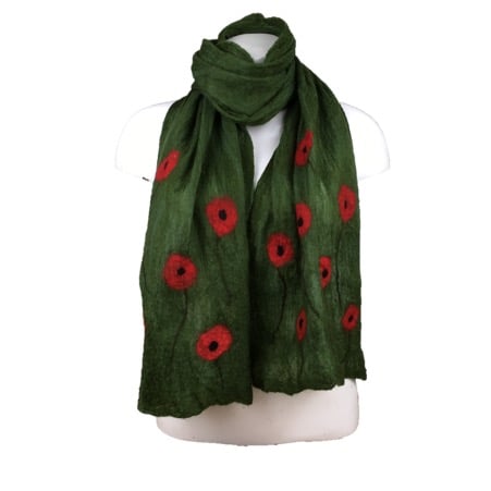 This gorgeously soft and warm wool and silk scarf is made using the nuno felting process. Fine layers of green merino wool are laid over both sides of a silk chiffon scarf and a poppy design added to one side prior to felting.