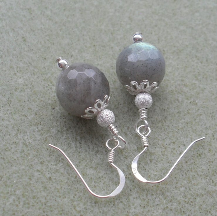 Labradorite faceted gemstones in a grey colour which have flashes of blue and gold as they move in the light are attached to sterling silver ear wires.