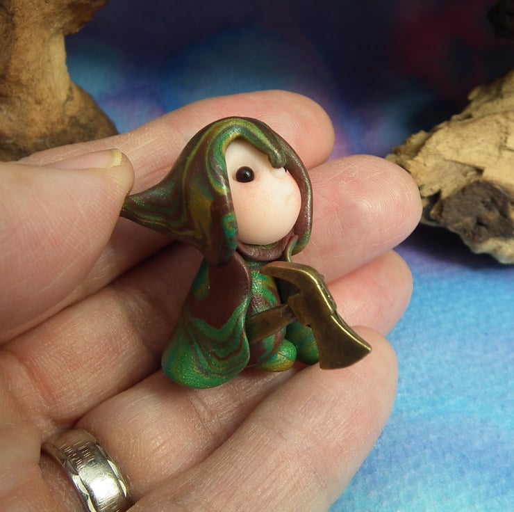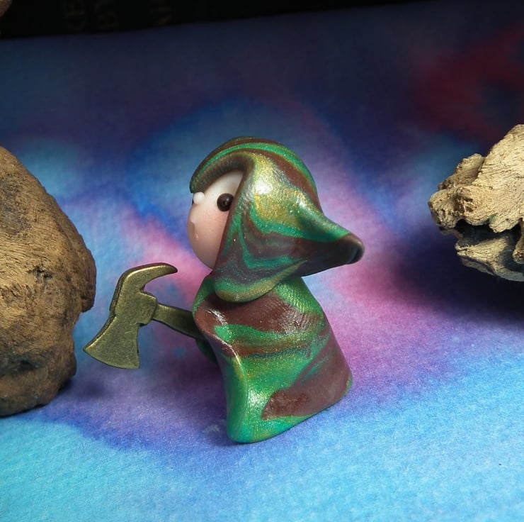 This is a 'one of a kind' creation having been entirely handmade without the use of moulds here at my studio on the Sussex Coast. Modelled with Prosculpt polymers, painted with heat set paints before sealing with lacquer, Hughie has sparkling black onyx eyes. Hughie the Warrior Gnome is just one and a half inches tall.