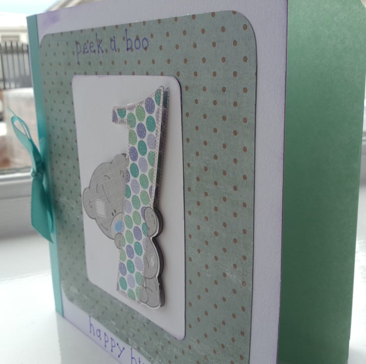 A completely handmade and uniquely designed card. Consisting of a cute decoupage of teddy bear peeking behind a number one. Mounted onto green spotted card then onto quality pristine white card. The number o email has glitter dots. Peek a boo and happy birthday handwritten in purple ink. Finished off with a co-ordinating pale green ribbon and bow.