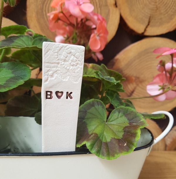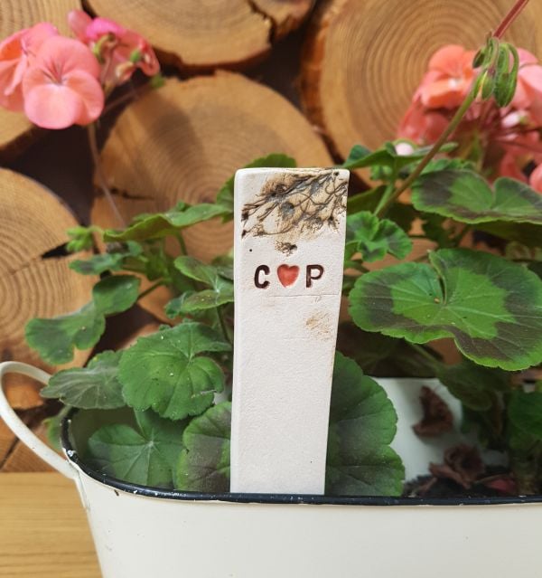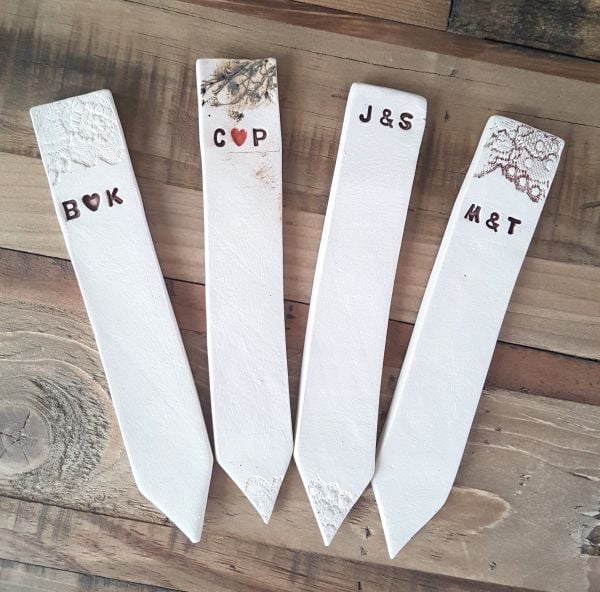 Handmade using an ivory coloured clay, these ceramic plant markers can be personalised with your wedding date or initials, and a pattern at the top if required.