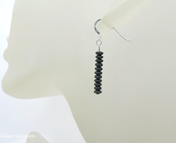 For these slim handmade beaded earrings I chose dark gunmetal grey Hematite 4mm x 2mm disc beads which have a frosted/matte finish.