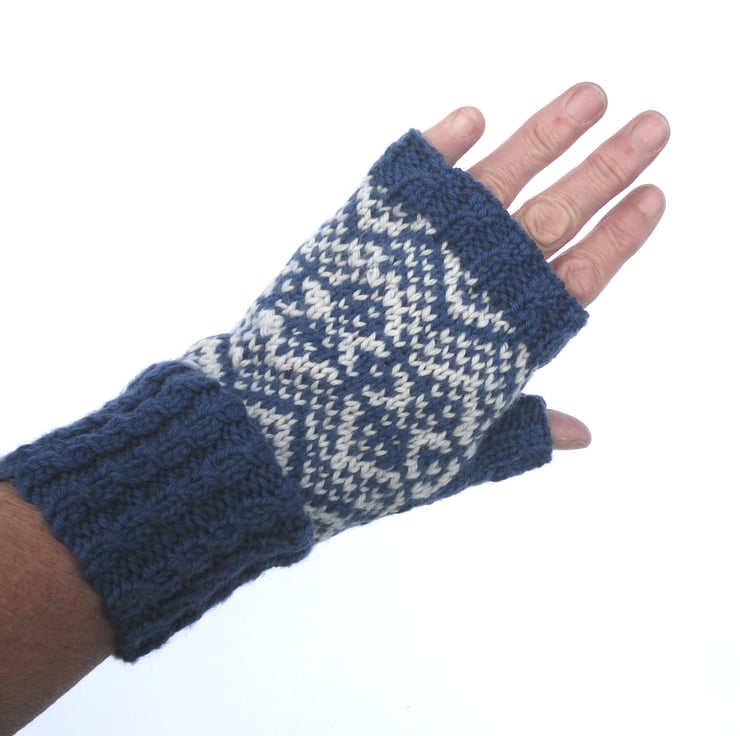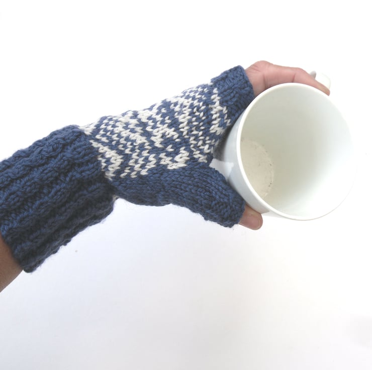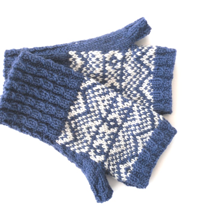 Navy blue hand knitted 100% wool fingerless gloves , knitted in fair isle / stranded knitting, great warming winter accessory & gift.