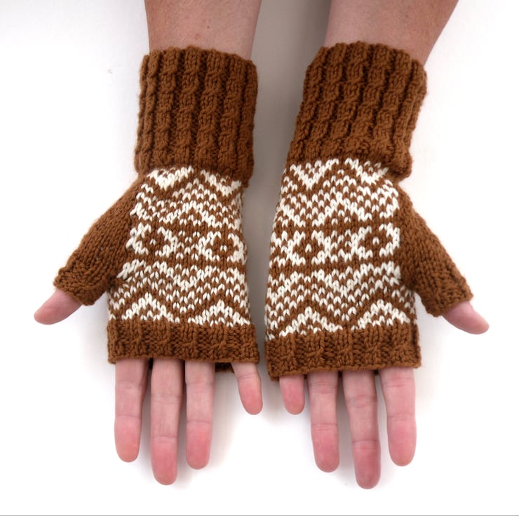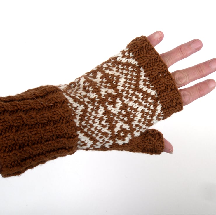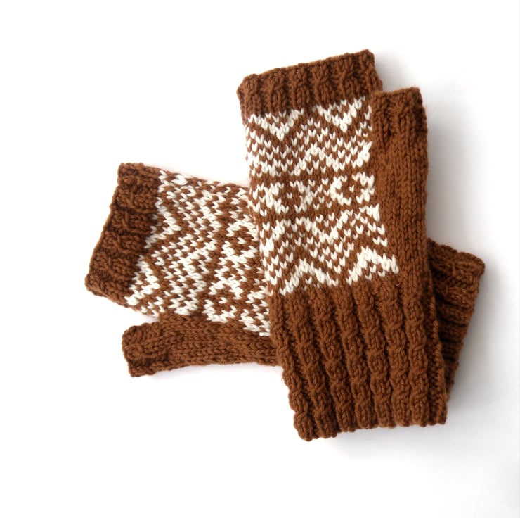 Coppery Brown hand knitted 100% wool fingerless gloves , knitted in fair isle / stranded knitting, great warming winter accessory & gift.
