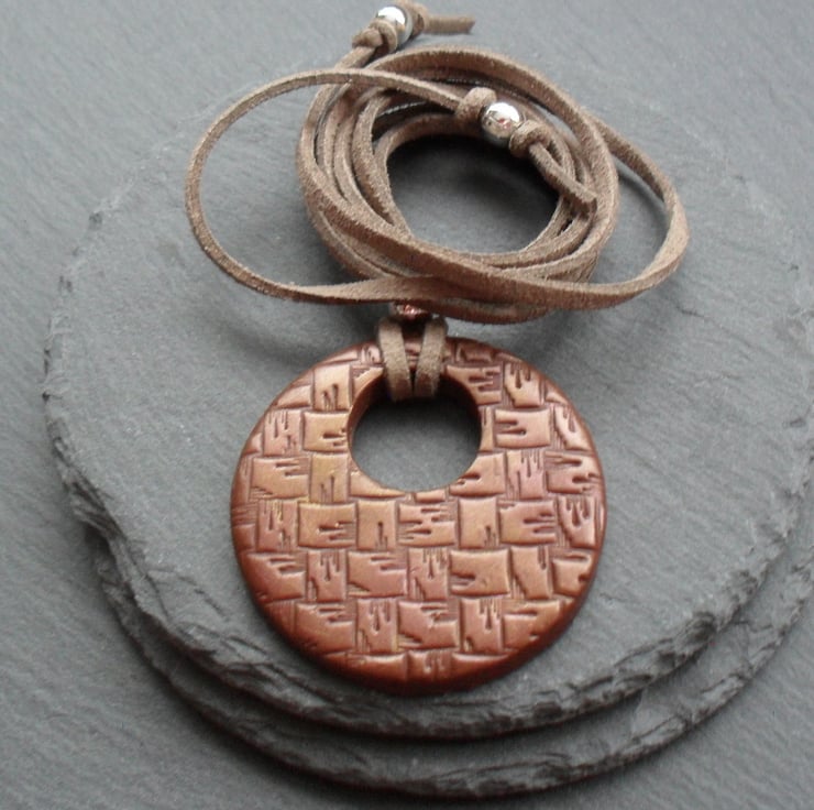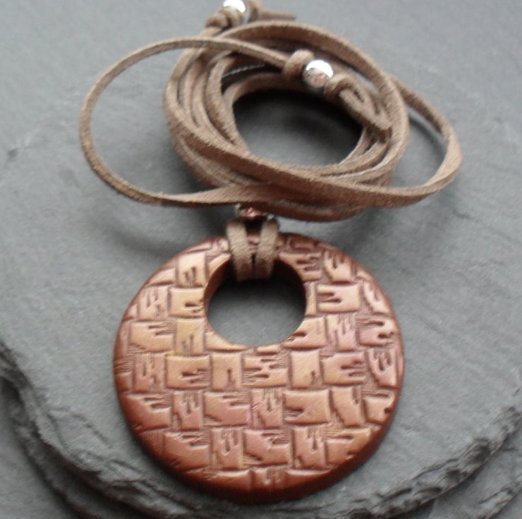 Pendant is attached to a faux suede cord which is left for you to tie which measures approx. 31 inches