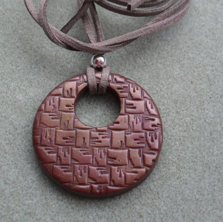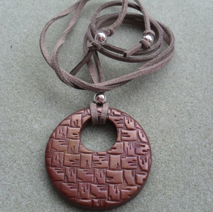 Brown clay which has a pattern and has some mica powder applied to give a metallic effect in bronze .and has 3 silver plated beads