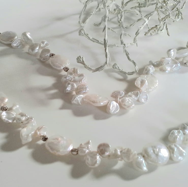 It has flat top quality coin shape keshi pearls with quality expensive kiwi pearls. All of the pearls have a good even natural lacra (luster), which only quality pearls display. The necklace has been constructed using professional stainless steel jewellers wire for added strength and durability, thus, avoiding the need to have it re-strung due to everyday wear on the string. I have finished it off with sterling silver bolt ring clasp with an extender chain. At the end of the sterling silver chain I have wire wrapped a coin pearl and incorporated faceted sterling silver beads within the design. The finished length including the extender is 19" inches.