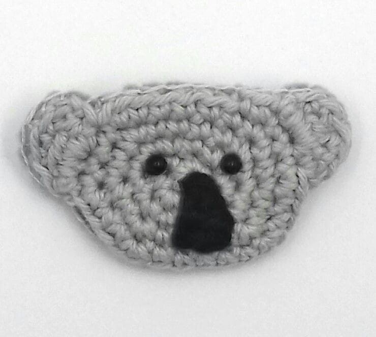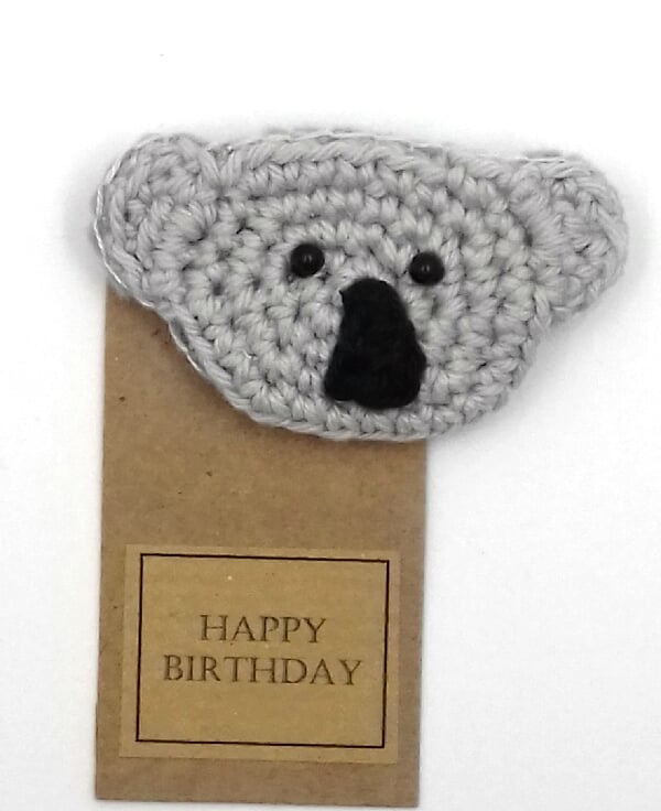 A small gift and birthday greeting in one!This little koala is crocheted in pale grey cotton and has beady black eyes. It is backed with two layers of felt and a brooch pin is firmly sewn in place. It measures approximately 6.5 cm by 4.5 cm and comes wrapped in tissue in a labelled PIP ( Postage in Proportion ) box all ready to be given or posted on.