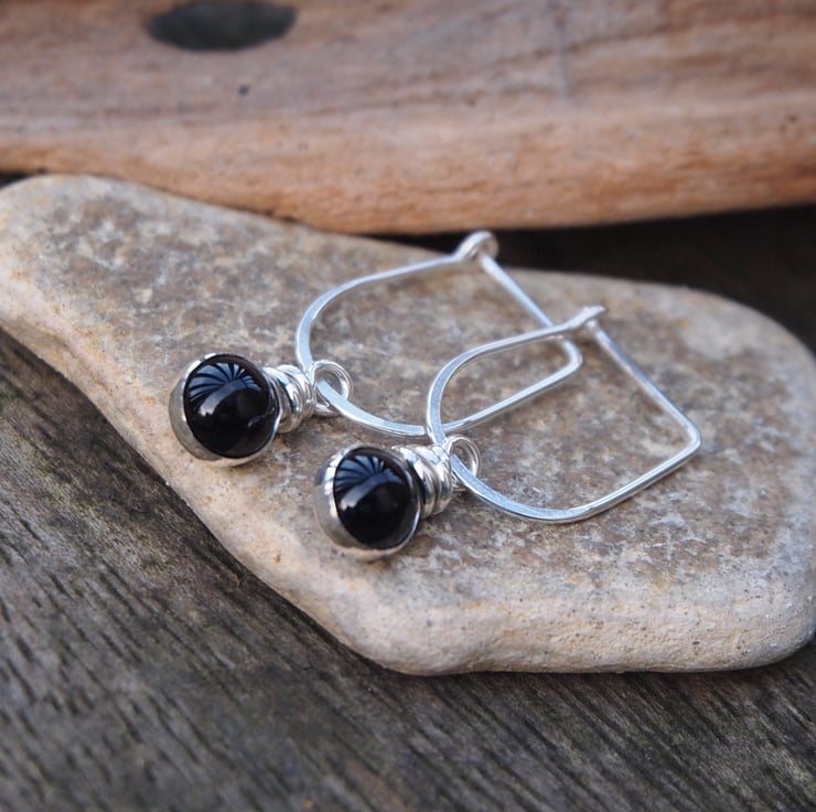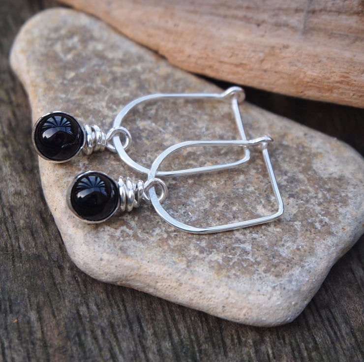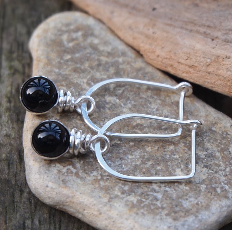 Black onyx drop earrings with a twist of silver. These earrings hang from handmade Argentium silver ear wires.