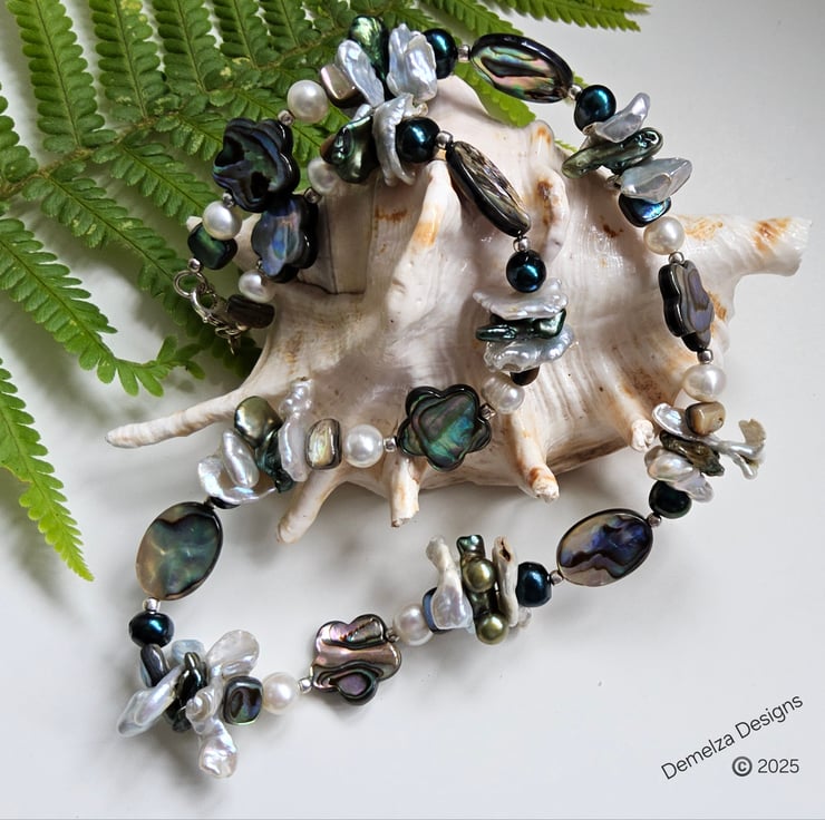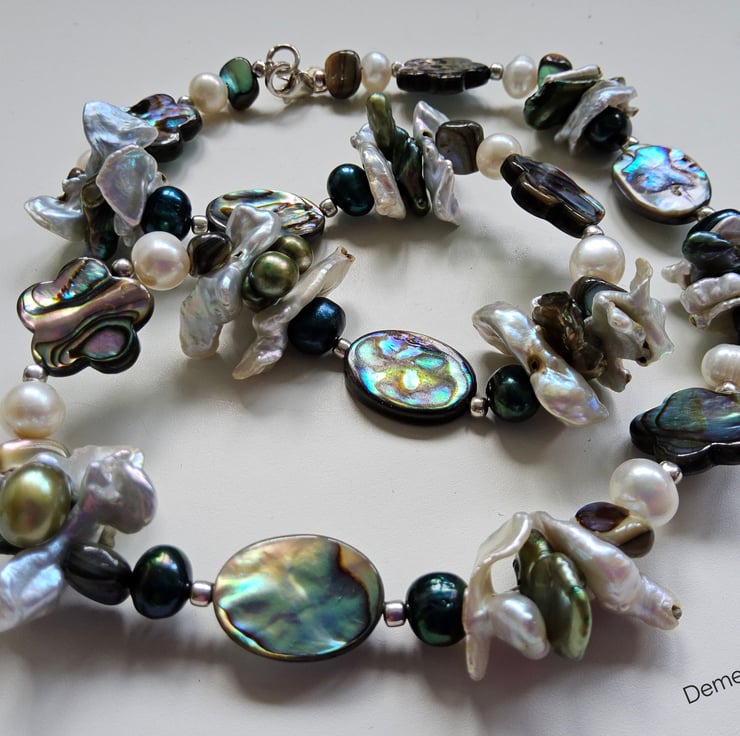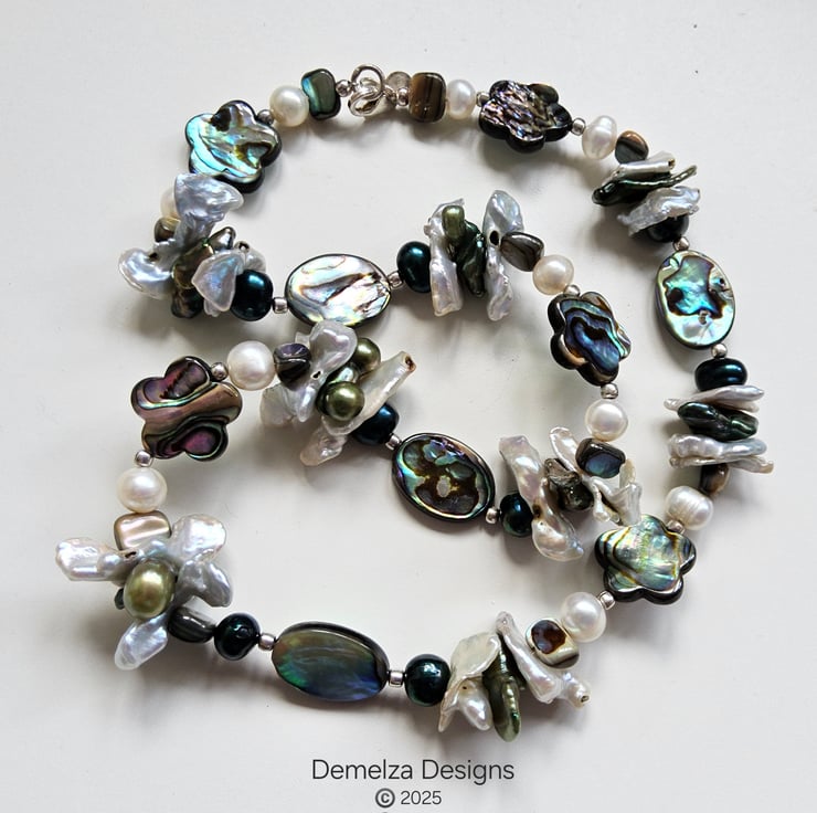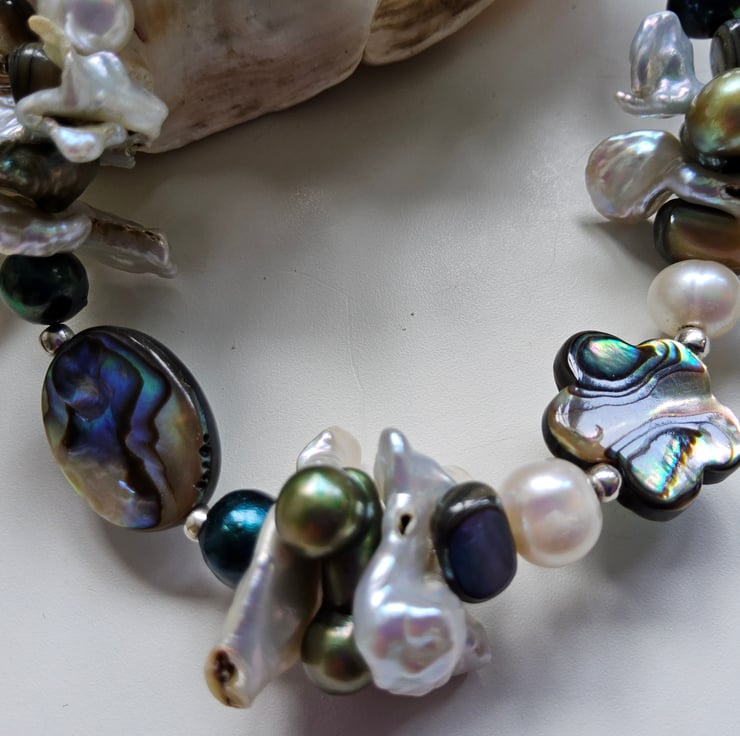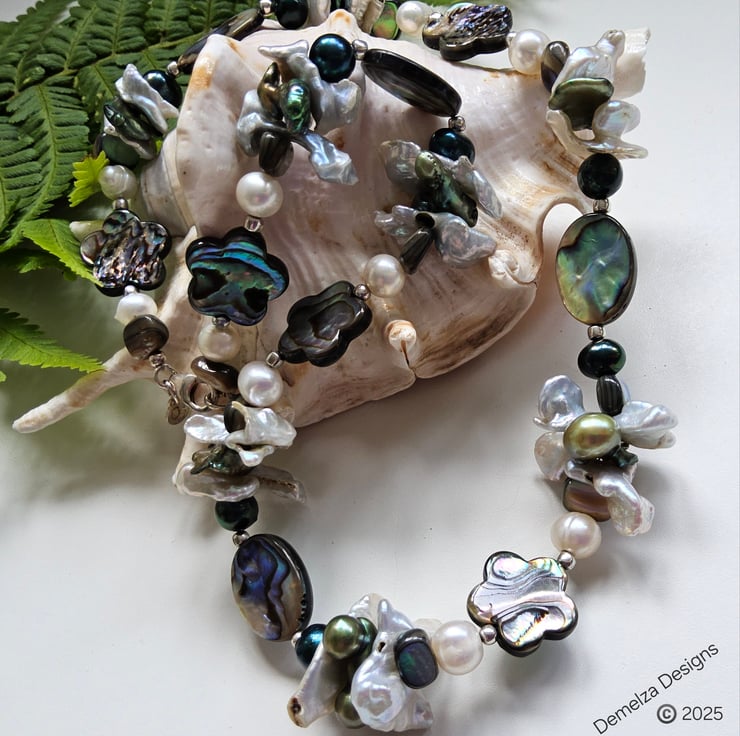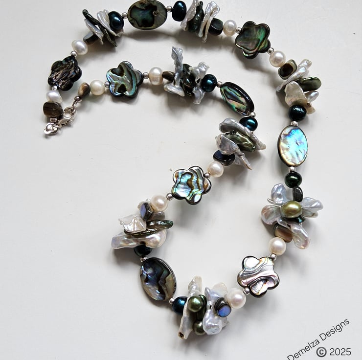 A very unique genuine designer necklace hand crafted in Cornwall using quality New Zealand Abolone Shell fancy cut flower and ovals, genuine natural kewi pearls with ivory white and bottle green fresh water culture pearls. Within the design throughout are 2mm sterling silver spacer beads adding sparkle during wear.