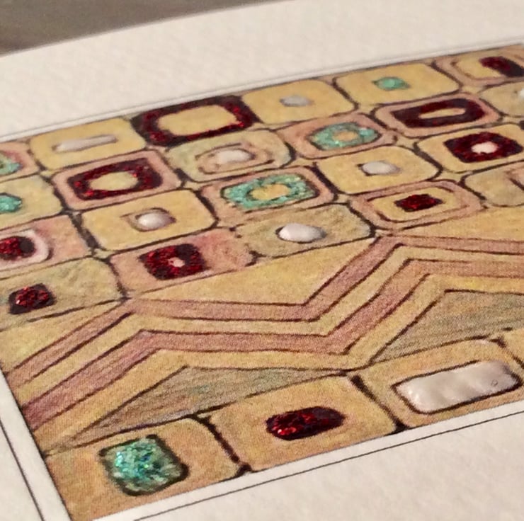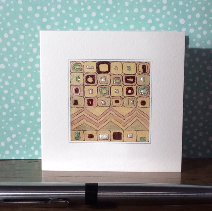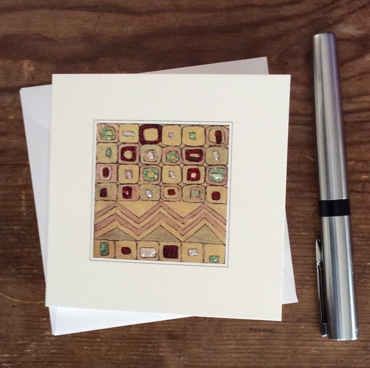Original embellished square Art Card inspired by Klimts’s jewellery. The gold patterned card is made up of squares and zigzags. It's printed on Thick textured Hammer off White Card measuring 10 x 10cm. Comes with an envelop in a plastic cover for protection.