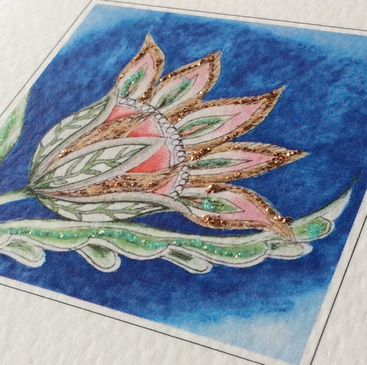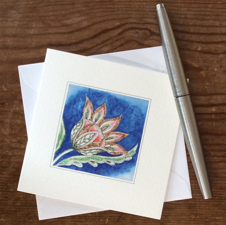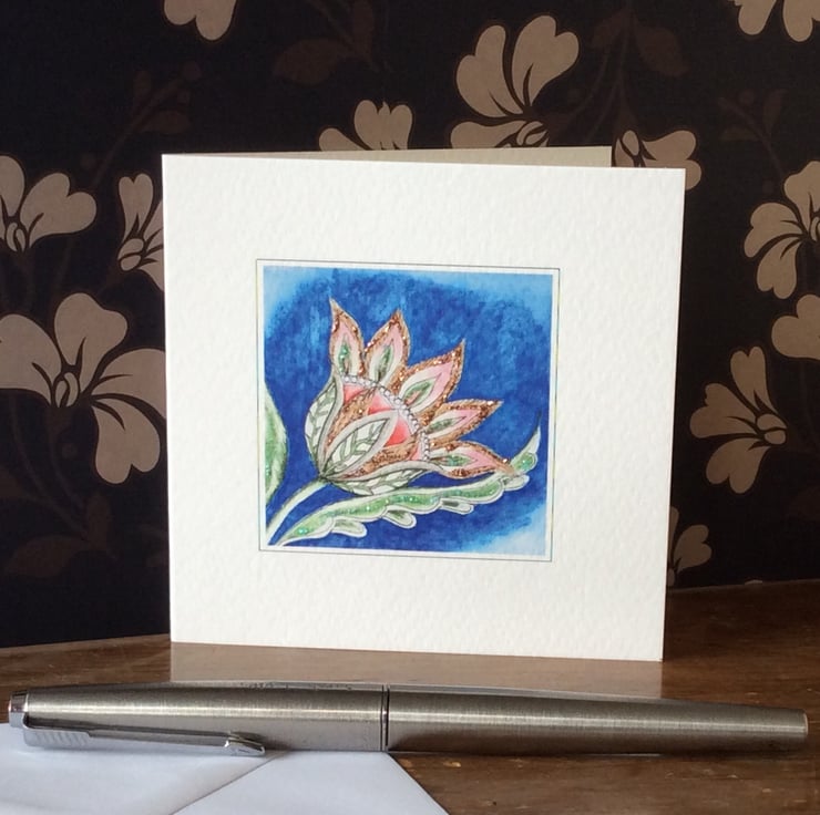 This beautiful art card shows a Jacobean inspired flower nestled in leaves and enhanced with glitter. It’s ideal for any occasion. It's printed on thick Hammer White Card measuring 10 x 10cm. Comes with an envelop in a plastic cover for protection.