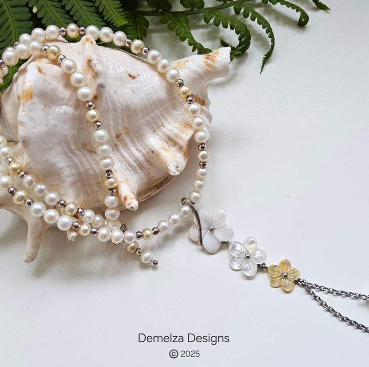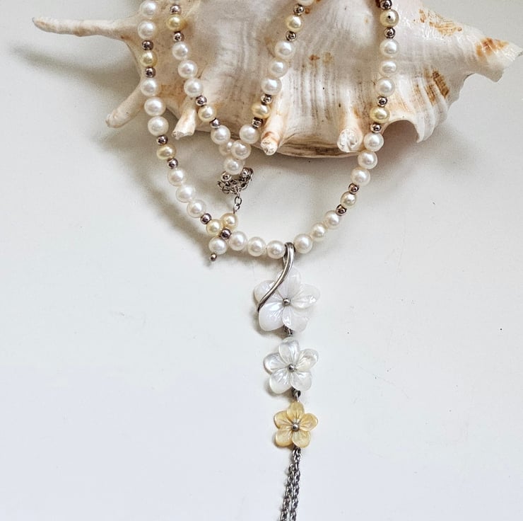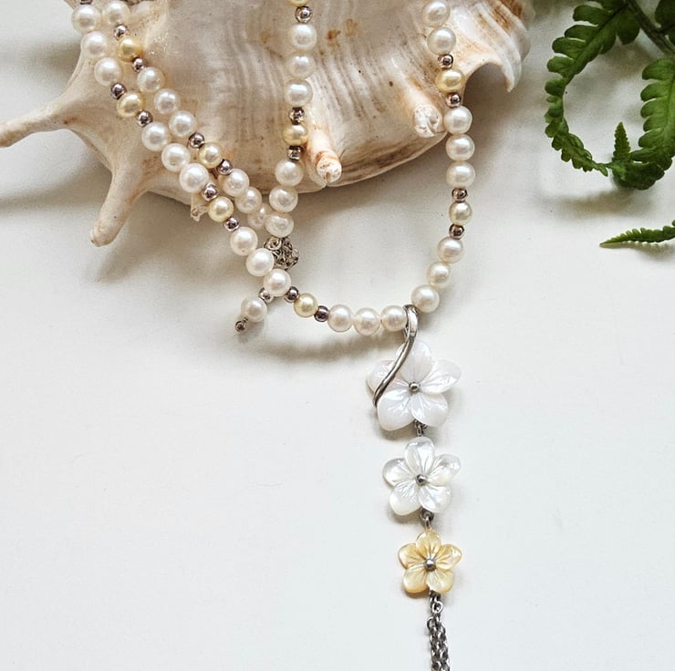 The necklace has a drop sterling silver pendant incorperated into the design quality genuine mother of pearl with a three flower design and two droplets with pearls on each end. The delicate freshwater culture pearls are a mix of ivory white and cream with smaller sterling silver spacer beads incorporated into the main necklace.