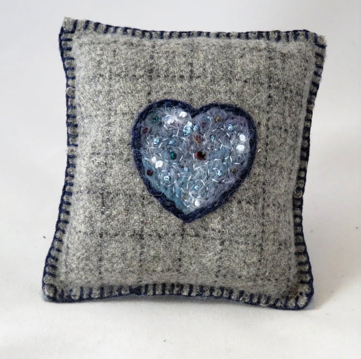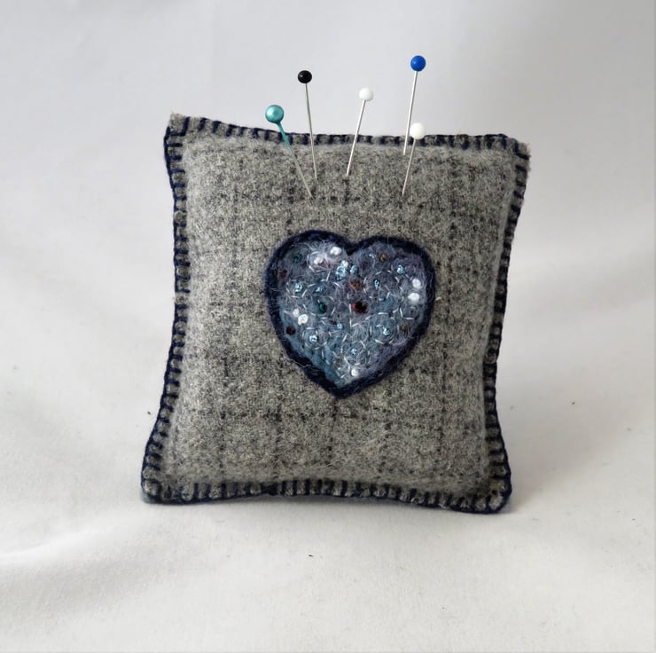SALE Heart Felted Pincushion on recycled tweed Blue and Grey
