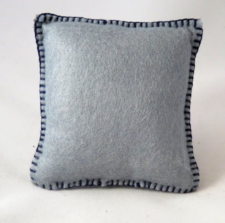 The back of the pincushion has been cut from grey 'eco' felt (produced from recycled plastic bottles). The back and front panels have been blanket-stitched together.