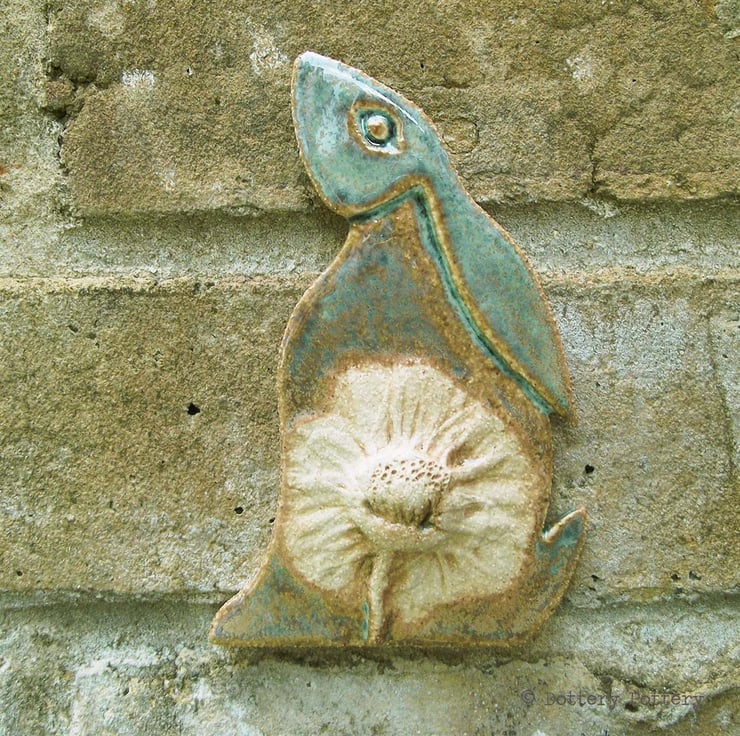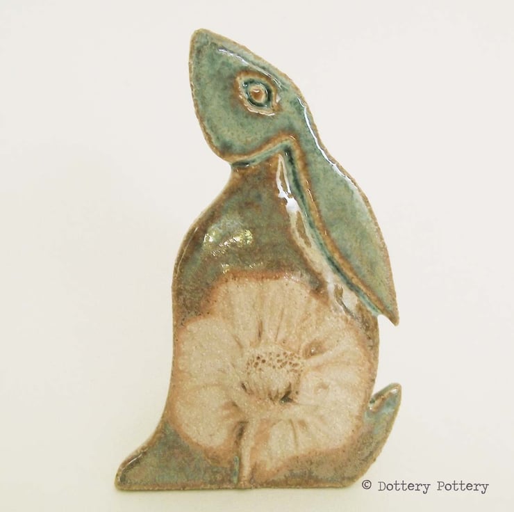 This delightful moon gazing hare is made from textured stoneware clay and decorated with pattern. It is cut from a hand drawn template.