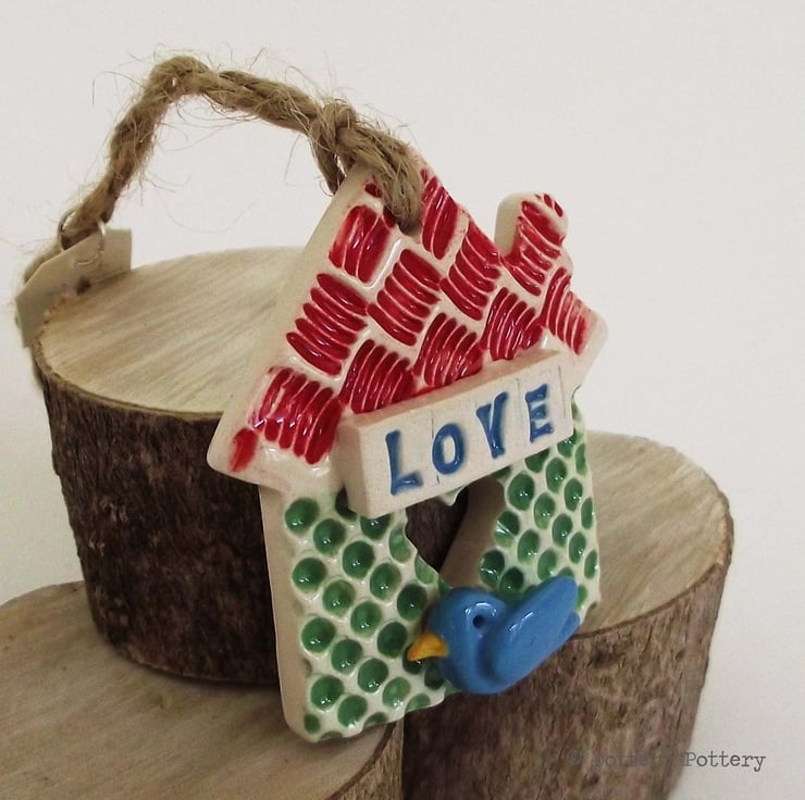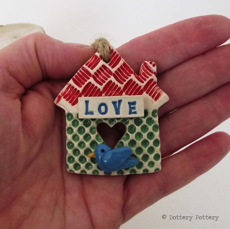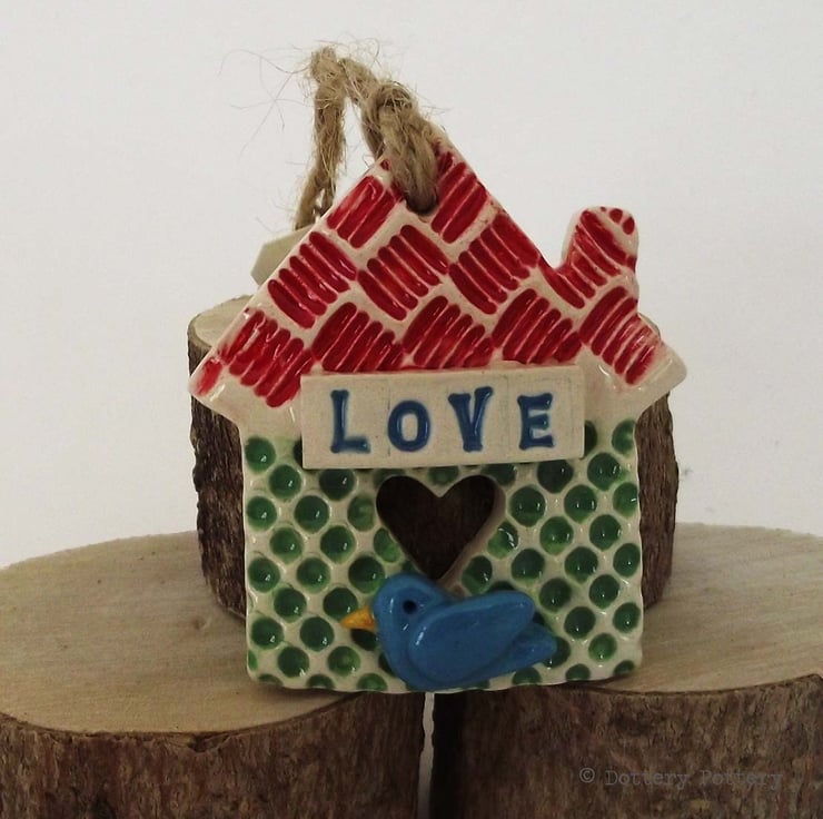 This little house decoration is made from white earthenware clay and finished in a variety of patterns and colours.