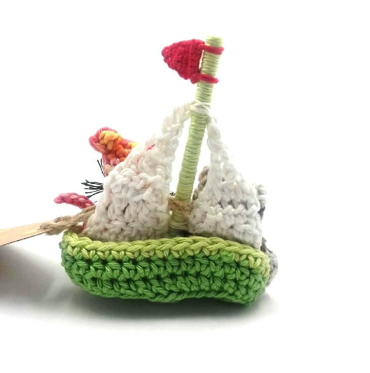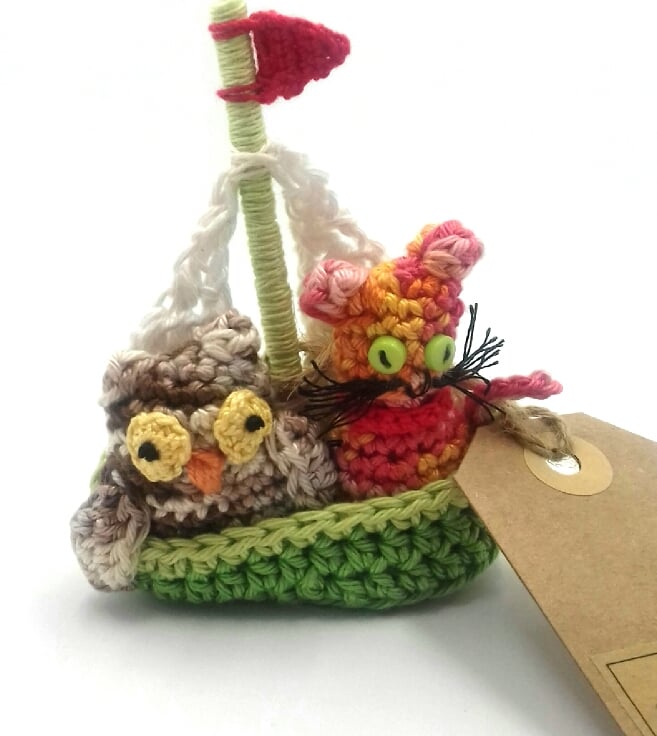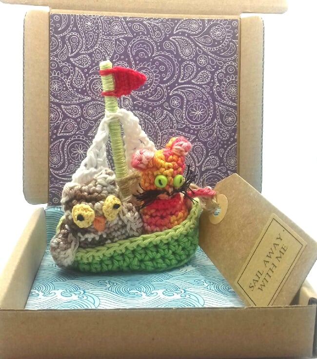 A keepsake gift and message in one and a great alternative to a traditional greetings card! This happy couple, setting sail,are crocheted in 100% cotton and filled with polyester stuffing. The boat is approximately 9 cm tall. The cat has tiny buttons for the eyes and the mast of the boat is made from a piece of lolly stick wrapped in cotton yarn. The animals have bern stitched into the boat to prevent accidents at sea!reads 'Sail Away with Me! '. Please note that I am very happy to exchange this tag for one with a message of your choice. This would make a lovely gift for a cotton wedding anniversary, Valentine's Day or even for a proposal!