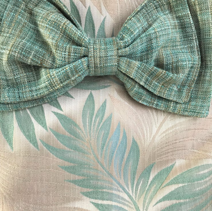 This leafy tote bag is made from a lovely pale beige fabric with a woven leaf pattern in beige and a fresh aqua green colour. The front of the bag is embellished with a band and an elegant large double bow in a green and beige coarsely woven fabric which co-ordinates beautifully with the colours in the leafy fabric. The bag is fully lined with pale aqua green fabric.