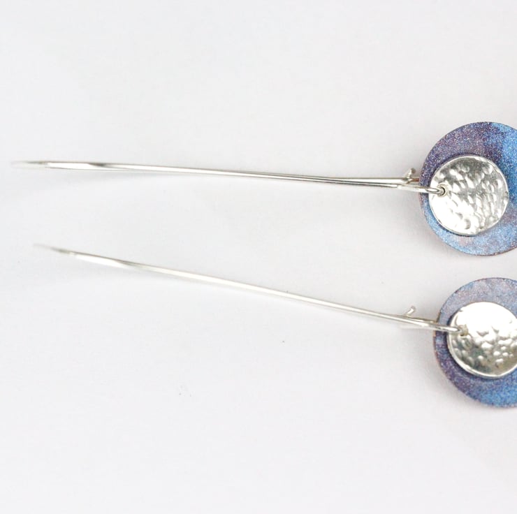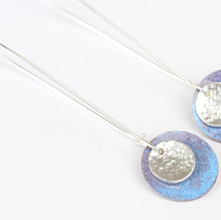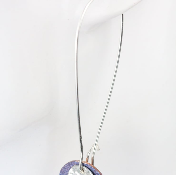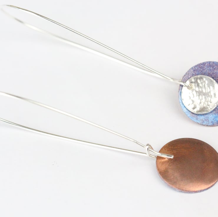 The larger discs are made from copper, and coloured with blue and purple enamels. The smaller disc is made from hammered sterling silver.