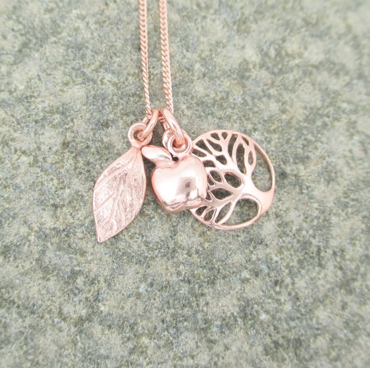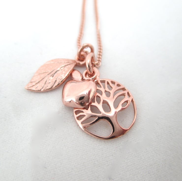 Rose Gold Plated Silver Necklace in most fashionable rose gold colour, with the symbols Tree of life, Apple and Leaf.