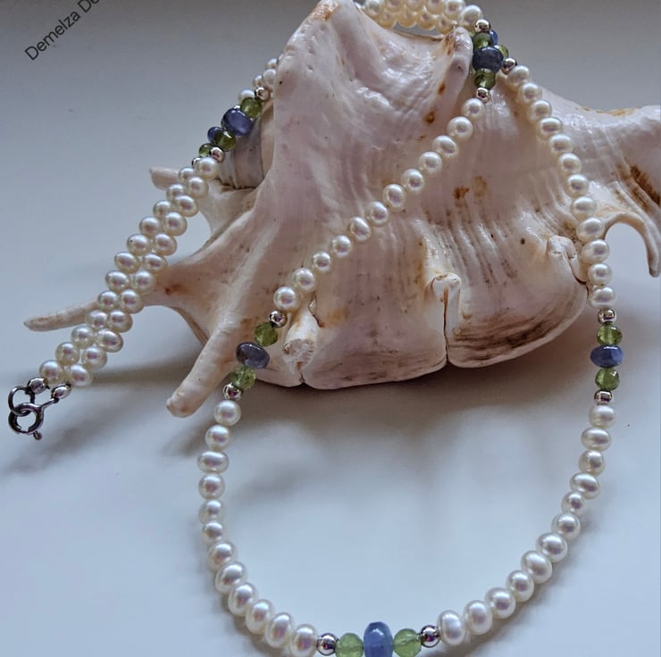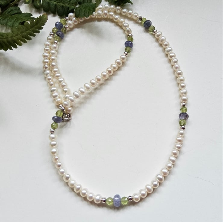 A beautiful femanine dainty looking AA tanzanite, freshwater pearl and peridot necklace will be ideal for everday wear y a professional working lady or for special occasions. It has been designed and hand crafted in Cornwall. This is a 'one off' availability item, so completely unique to gift a loved one.