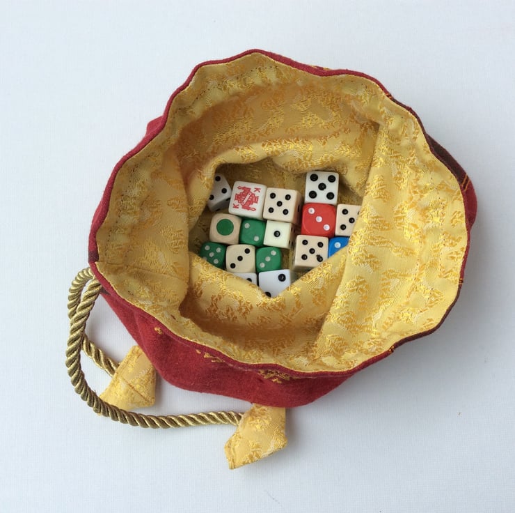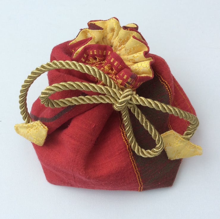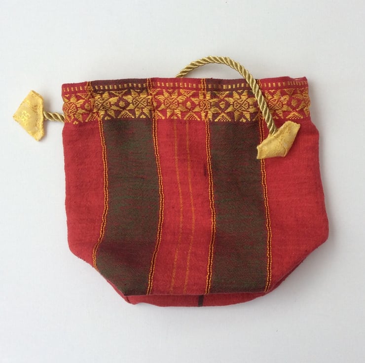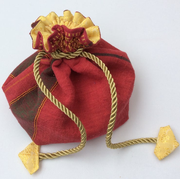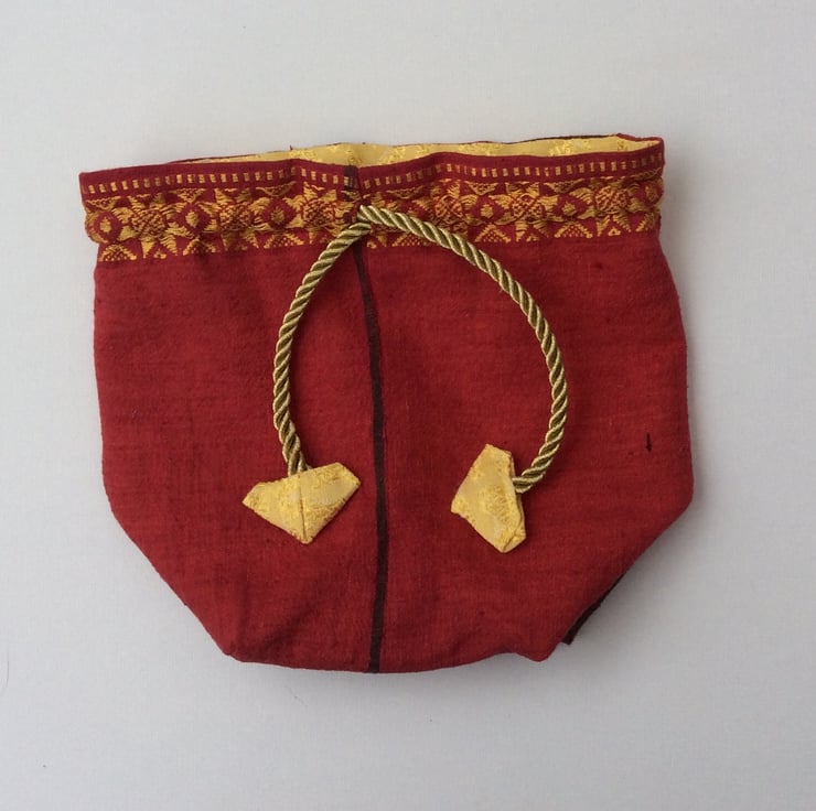 This drawstring bag is made from red Indian cotton with an embroidered gold edging and panels of green. It is lined with a rich yellow gold fabric and fastened with a gold, twisted cord drawstring. The bag would be perfect for holding precious dice, jewellery or other items of worth.