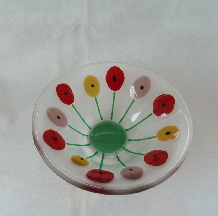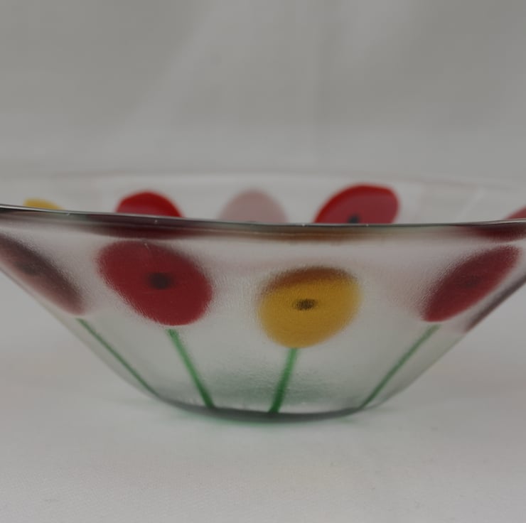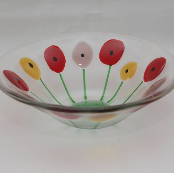 The flowers are red, yellow and pale pink rising up the sides of the bowl on green stems from a central green circle. It is one of my favourite designs!