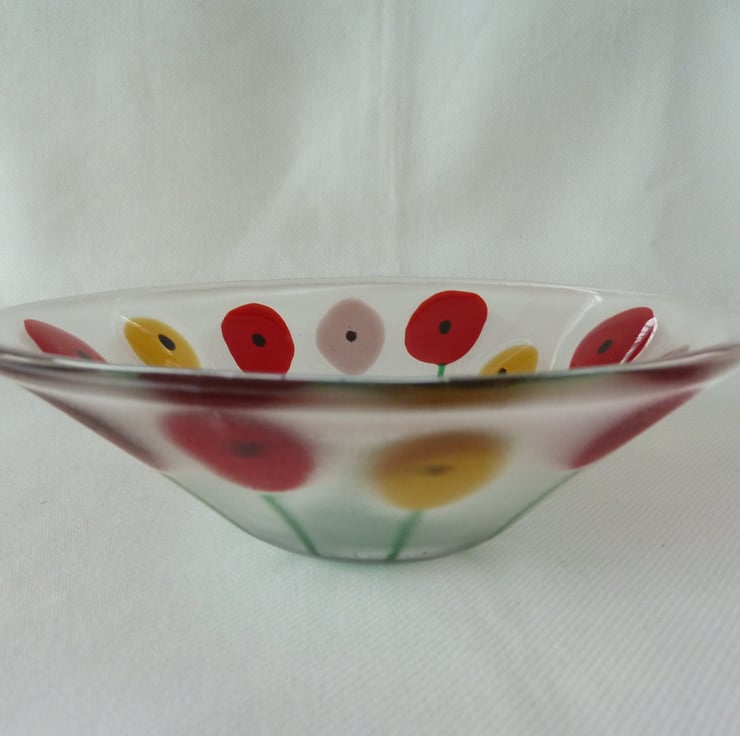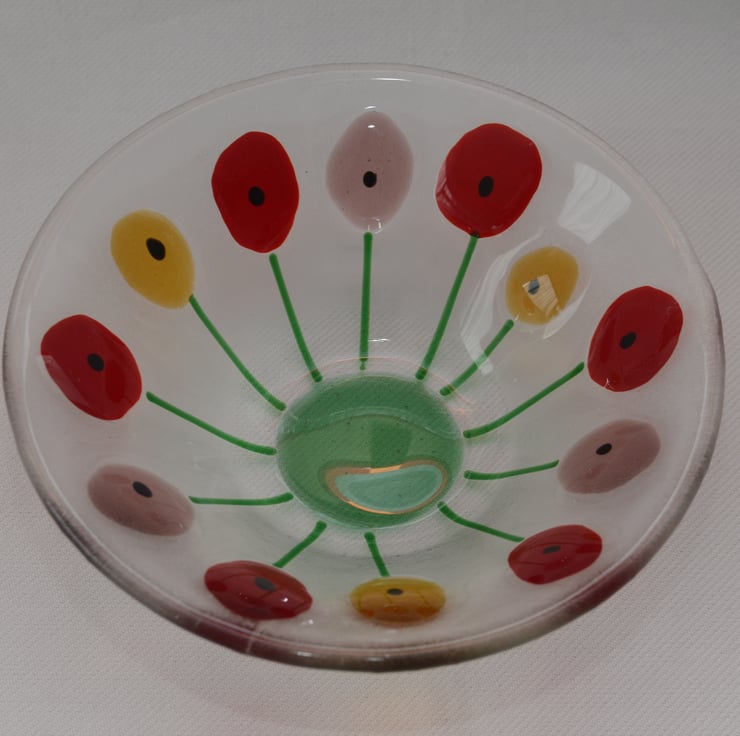 This is a fused glass bowl with a colourful poppy flower design.