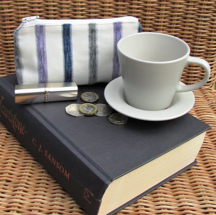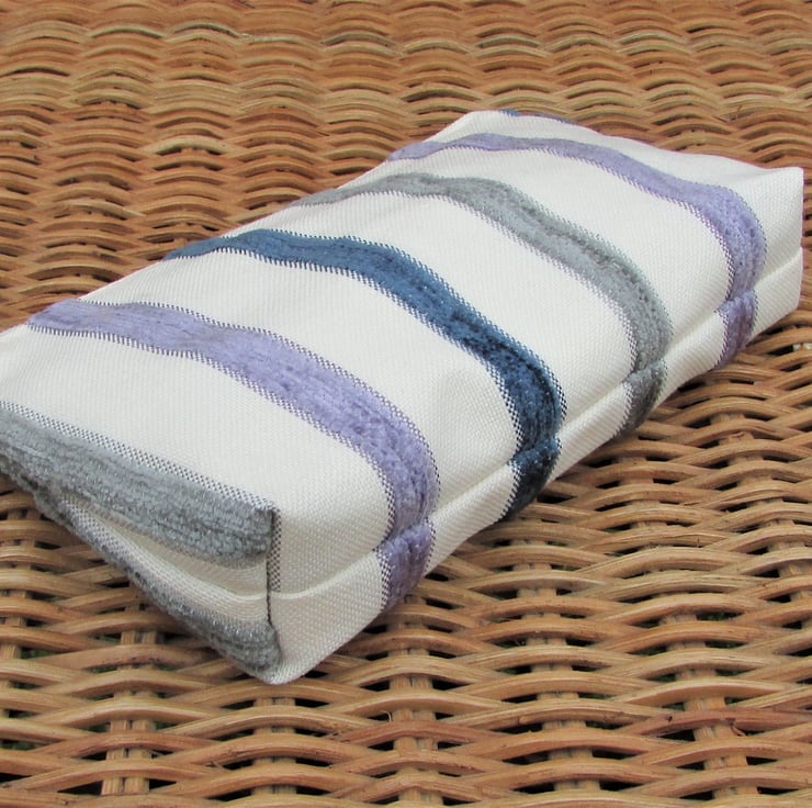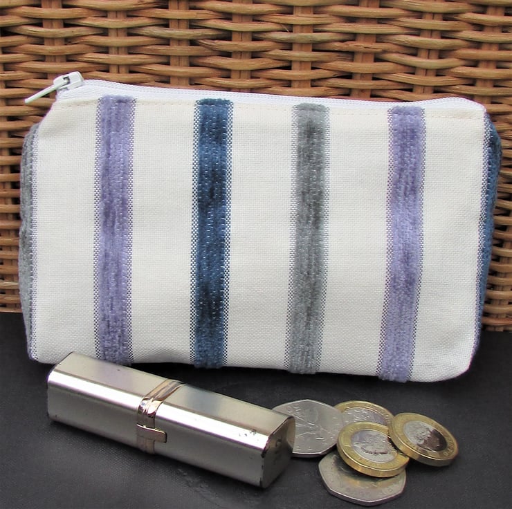 A large coin purse in pale cream fabric with luxurious textured velvet-finish stripes in lilac, blue and grey. The coin purse has a pale cream zip and is lined with cream fabric. The base of the purse is boxed to give a spacious interior.