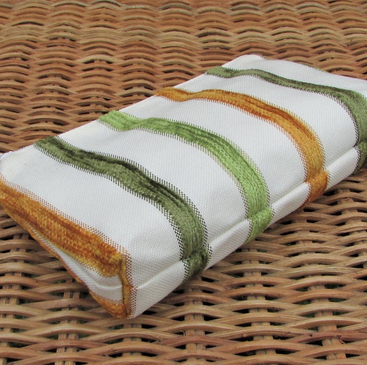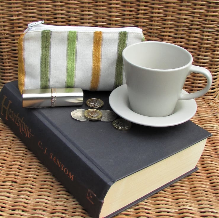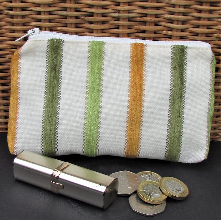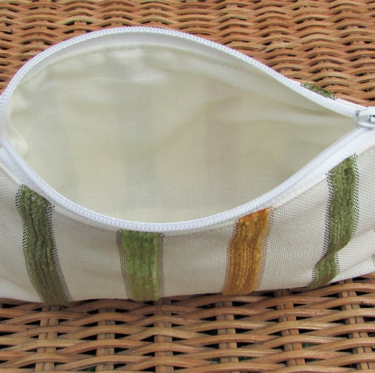 A large coin purse in pale cream fabric with luxurious textured velvet-finish stripes in pale green, dark green and golden yellow. The coin purse has a pale cream zip and is lined with cream fabric. The base of the purse is boxed to give a spacious interior.
