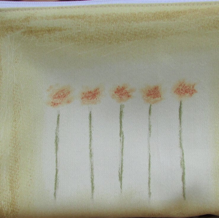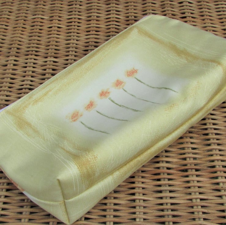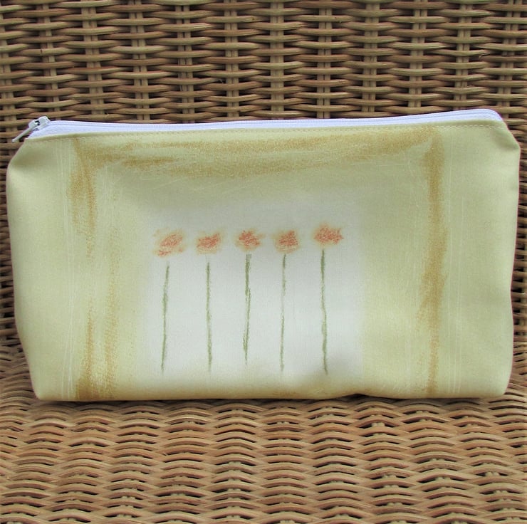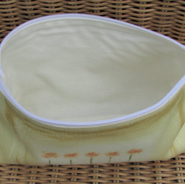 A pretty cosmetic bag in a pale yellow fabric with a floral print pattern featuring five stems of peachy orange flowers. The make up bag has a white zip and is lined with cream fabric. The base of the bag is boxed giving lots of space inside.
