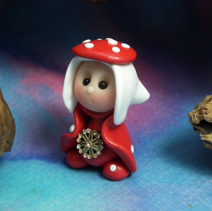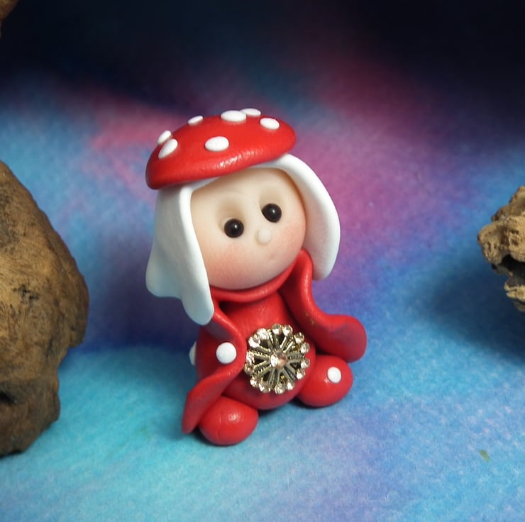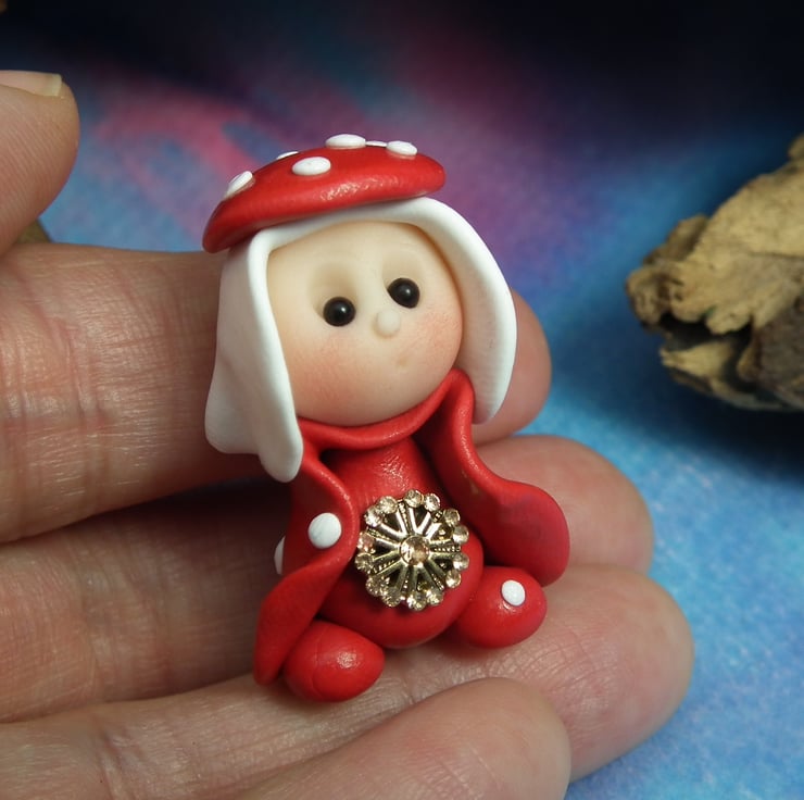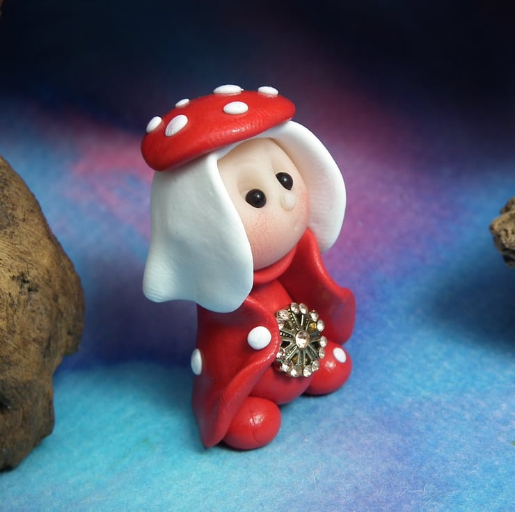 This is a 'one of a kind' creation having been entirely handmade without the use of moulds here at my studio on the Sussex Coast. Modelled with Prosculpt polymers, painted with heat set paints before sealing with lacquer, Sadie has sparkling black onyx eyes. Sadie the Toadstool Gnome is just one and a half inches tall.