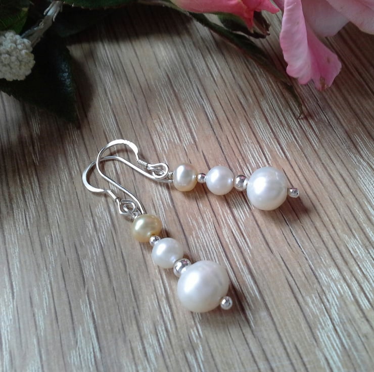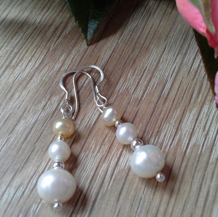 A sweet little pair of genuine freshwater culture pearl earrings ideal for a future bride to frame herface. The earrings have been constructed using all sterling silver components including the beads and hooks. The pearls display a verygood even natural lacra formation, topical of quality pearls. However, each one has a slightly variation on colour and size abd every effort is made to colour match a pair of earrings.