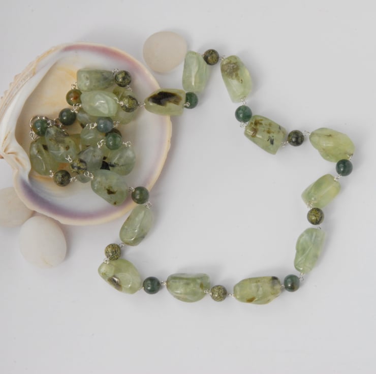 This beaded necklace features irregular smooth nuggets of fresh green prehnite mixed with rounds of mottled yellow green serpentine and deeper green moss agate. Each bead is individually rosary linked on sterling silver to give this longer length necklace drape and movement. It is fitted with a trigger clasp and jump ring but the longer length means that I can get it over my head without using the clasp NB whether you will be able to do that will depend on the size of your skull and hair style please check the length against one of your existing necklaces to find out if you will be able to do this.