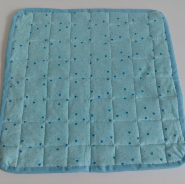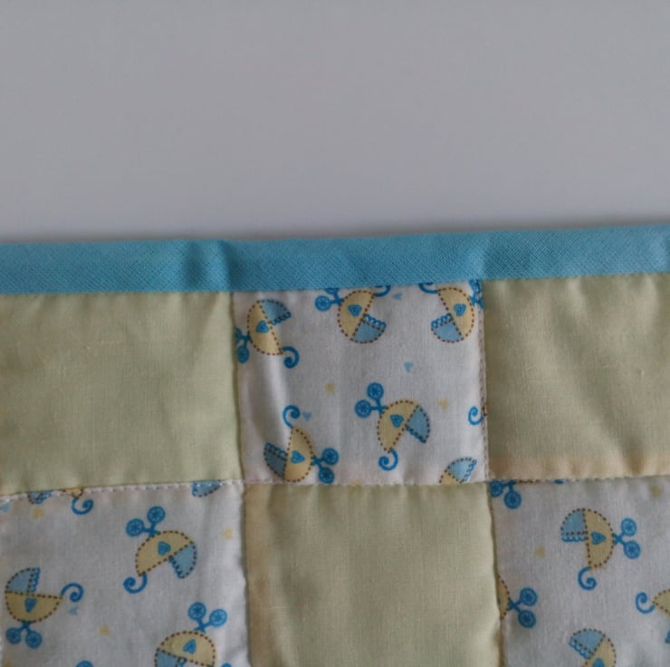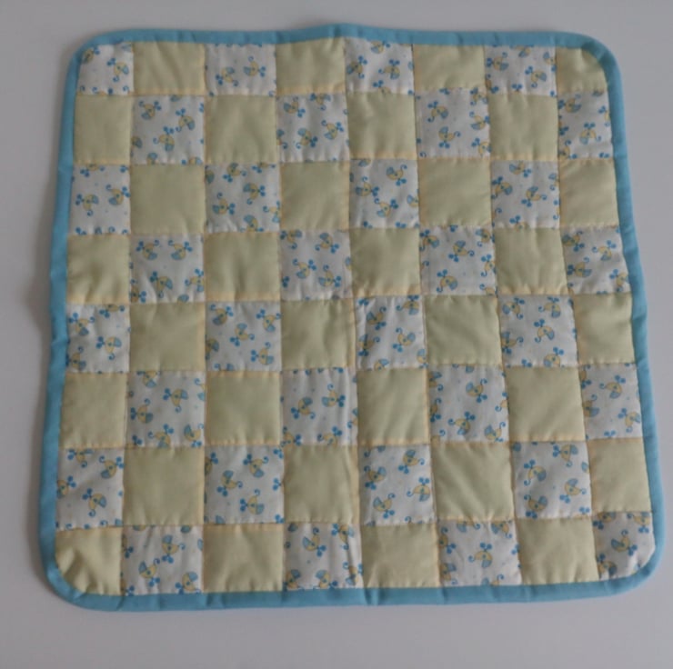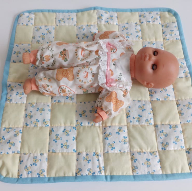 A patchwork doll's quilt with yellow and a pram design squares with blue binding. Backed in a pale blue jersey knit fabric. Measures approx 42cm square. Ideal for use in a baby doll's pram or doll's cot. (Doll not included)