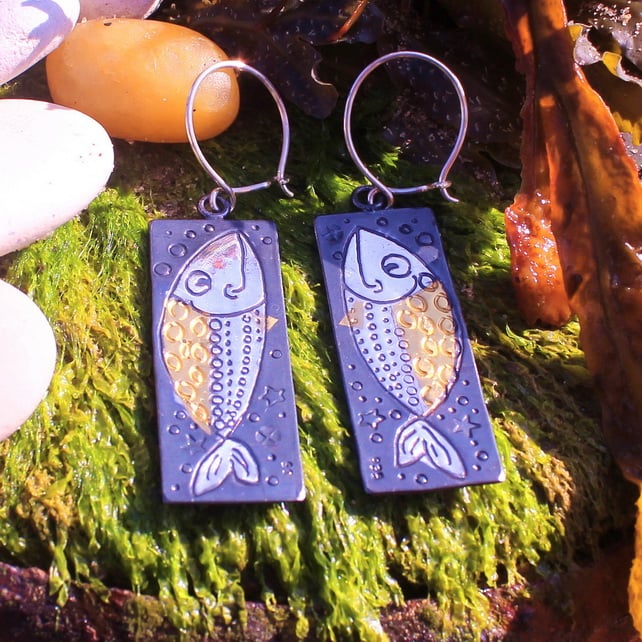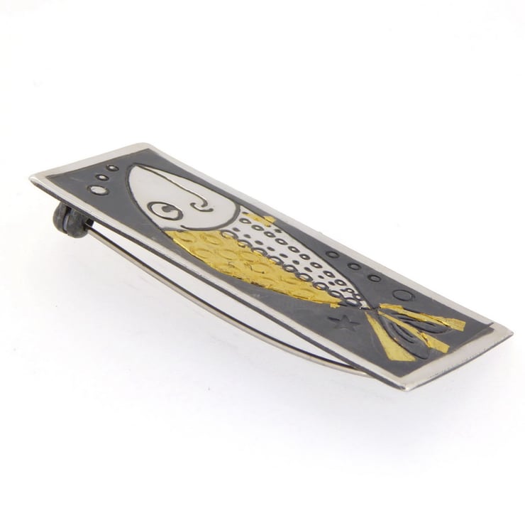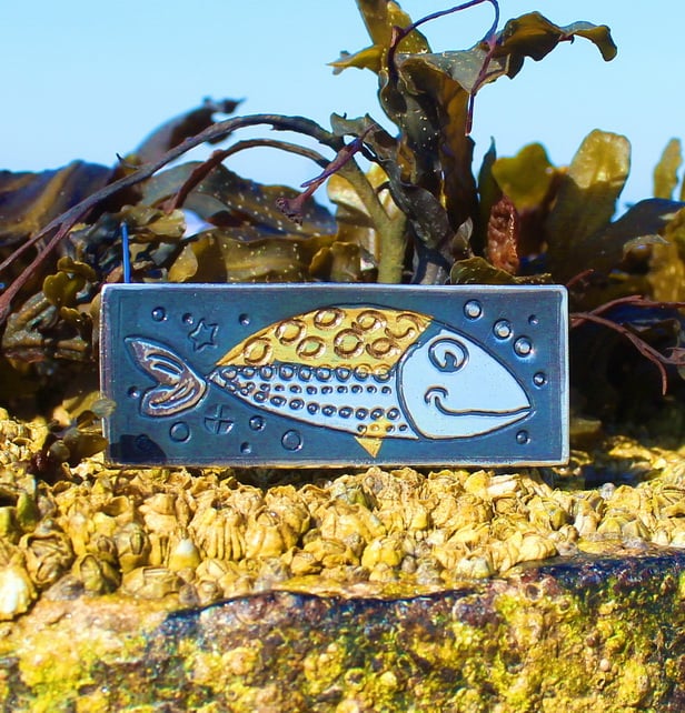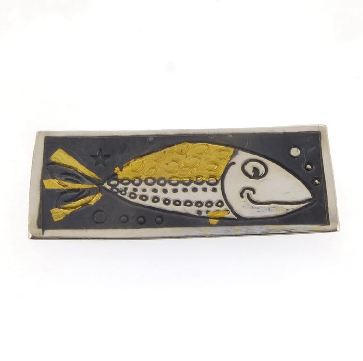 This lovely fish brooch is handmade by us, in our workshop in Yorkshire. It is made from sterling silver and 24-carat gold. We utilize an ancient Korean technique known as Keum Boo, which involves fusing gold to silver at high temperatures. The brooch features an oxidised finish that gives it a black colour, while certain areas are highly polished to create a beautiful contrast between the black, gold, and shiny silver. Measuring 2cm in height and 4.5cm in length, this brooch can be complemented by matching fish earrings, which you can find in one of the images above.