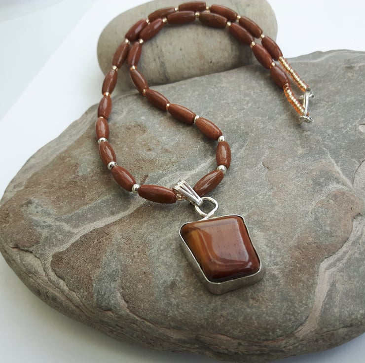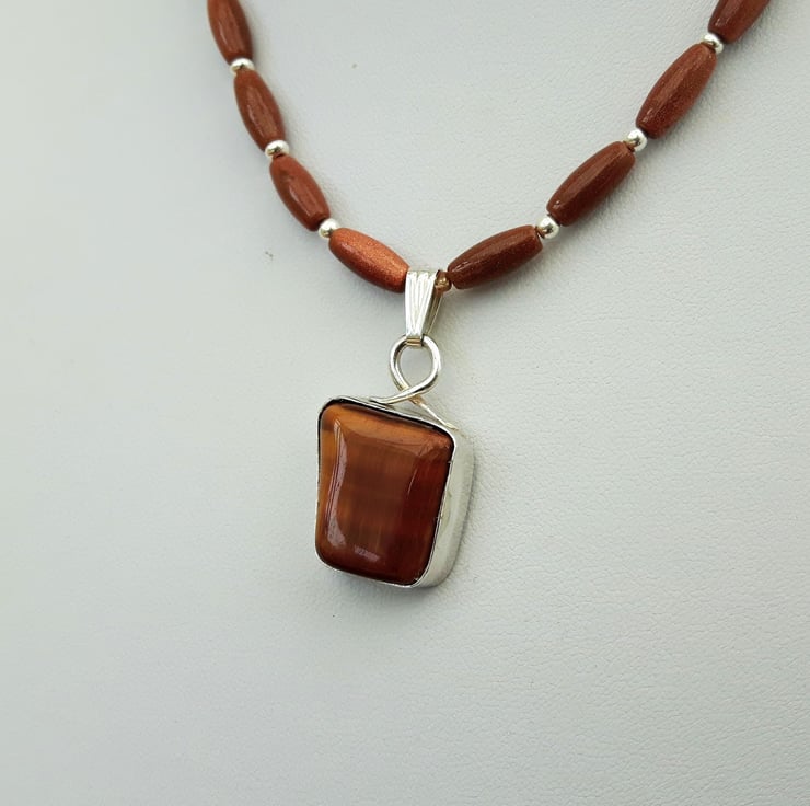 This gorgeous necklace features a freeform pendant of golden tiger's eye displayed in an open-backed sterling silver bezel setting. The pendant is a rhomboid shape and measures approximately 2x3cm. It has an integral bail and is suspended from the necklace by means of a sterling silver clip-on bail, allowing the necklace to be worn with or without the pendant. The necklace is made up of oval beads in amber coloured goldstone, interspersed with round sterling silver beads and gold coloured seed beads. Goldstone is a man made material which has tiny metallic inclusions, twinkling like stars in the sky. The length of the necklace is 16.5inches/42cm. It is fastened by means of a sterling silver hook and ring clasp which has been hallmarked by the London Assay Office. This necklace will be wrapped securely, packaged in a gift box or organza bag and sent by Royal Mail first class post in the UK and Europe, or by guaranteed delivery to other countries.
