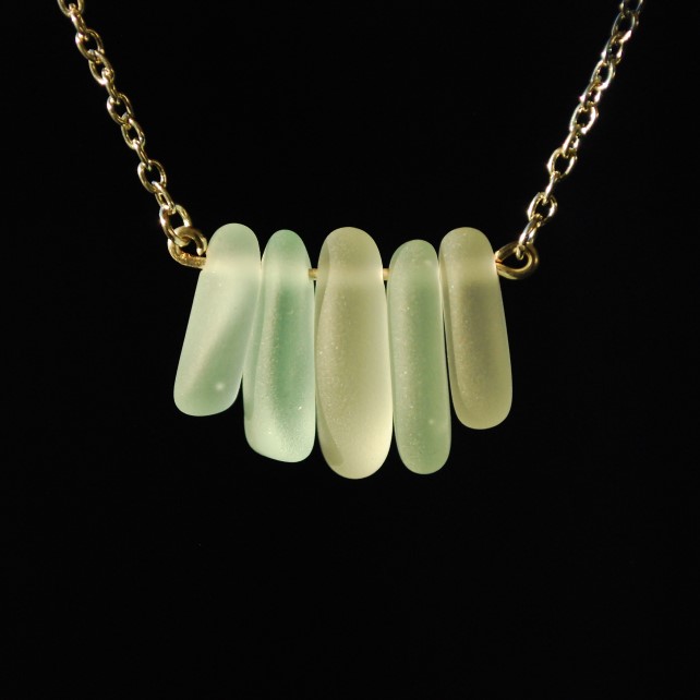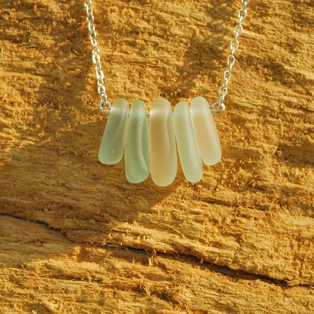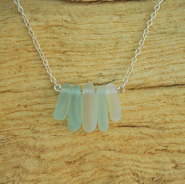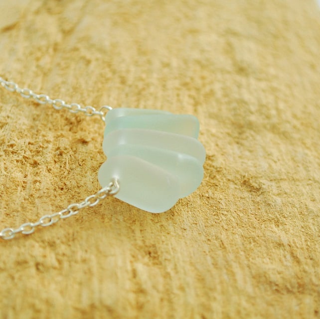 Five wonderfully thick pieces of tumbled beach glass, in shades of white and pale aquamarine, make this pendant an eye catcher. We have tumbled the glass so it is silky smooth. The pendant is mounted on silver plate chain.
