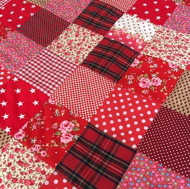 Gorgeous patchwork quilt made with a selection of Red cotton fabrics with a tartan fabric trim and white cotton back