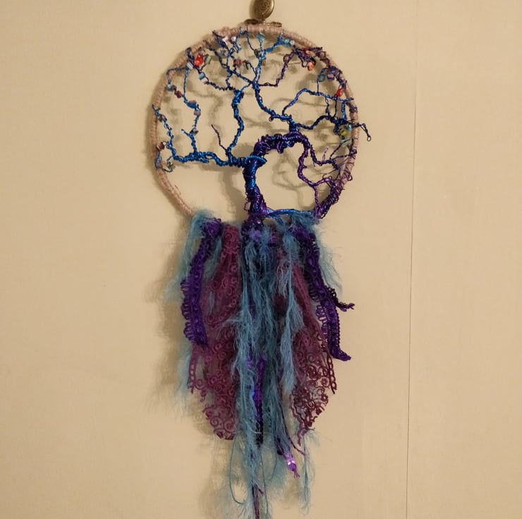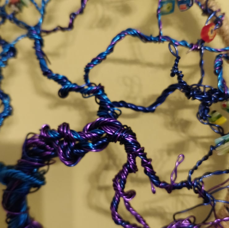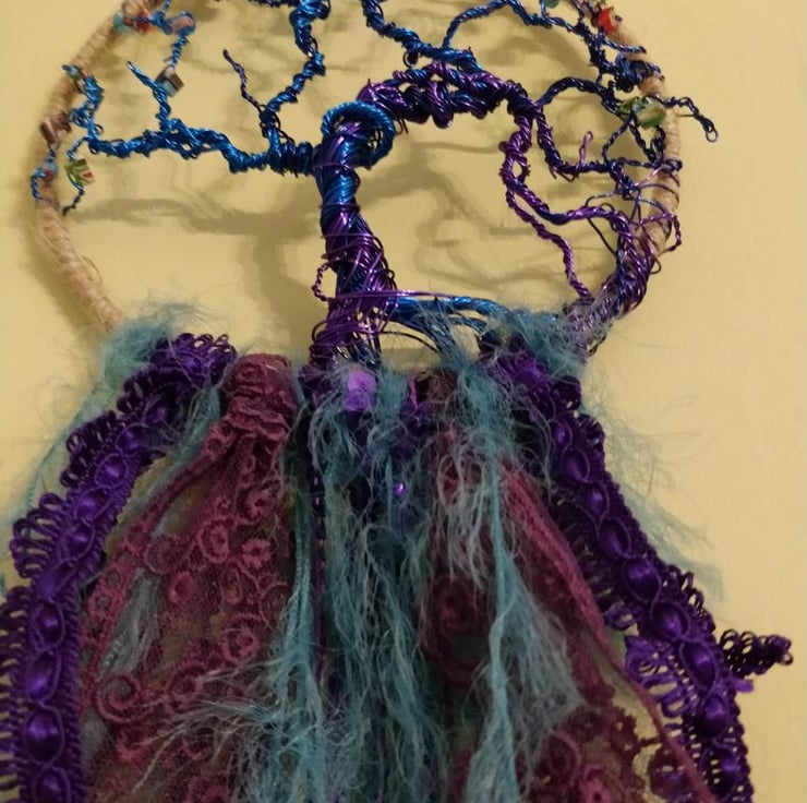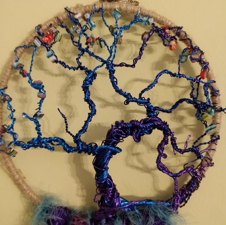 Exquisite hand twisted tree of life, crafted onto a 6 in diameter metal ring wrapped in natural jute twine using purple, navy and electric blue coloured copper wire.