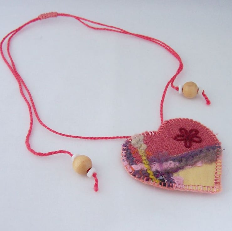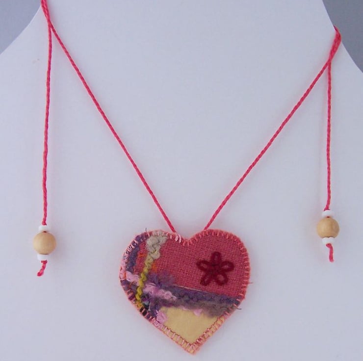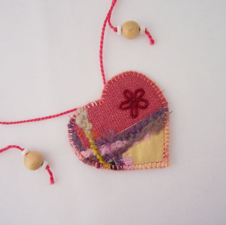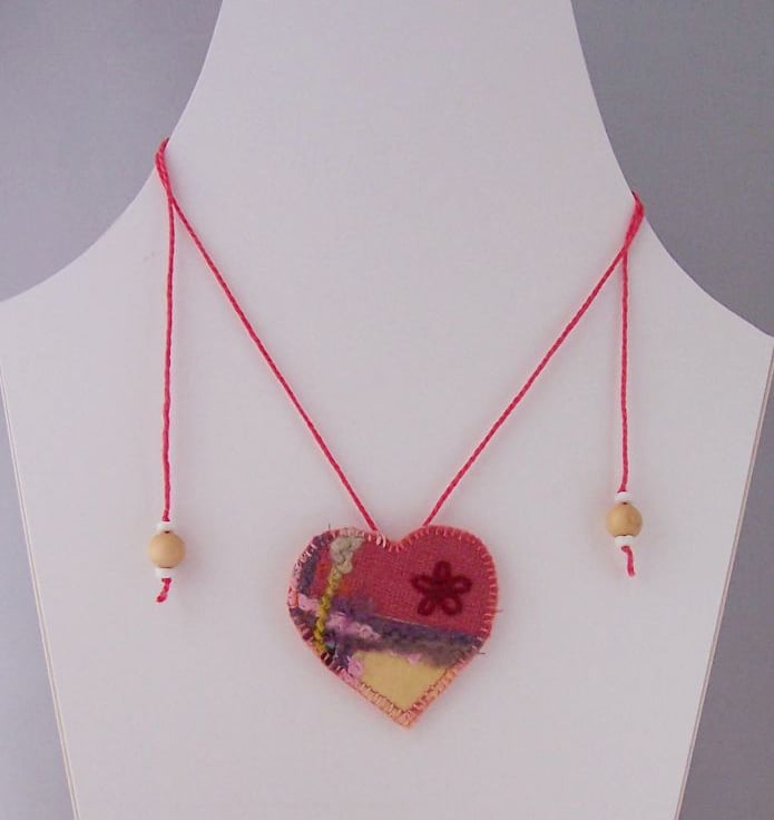 Mixed fabric heart shaped textile pendant with machine embroidery and hand embroidery.