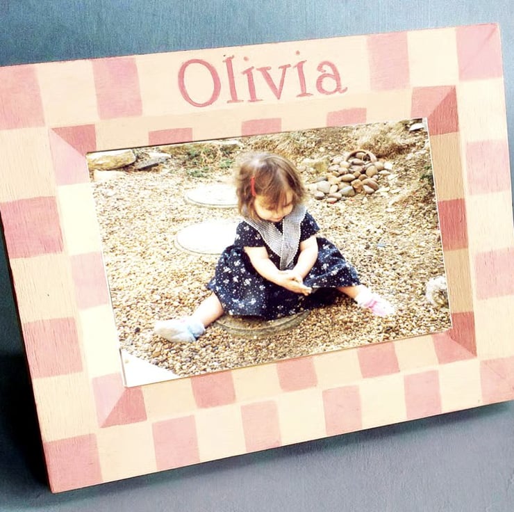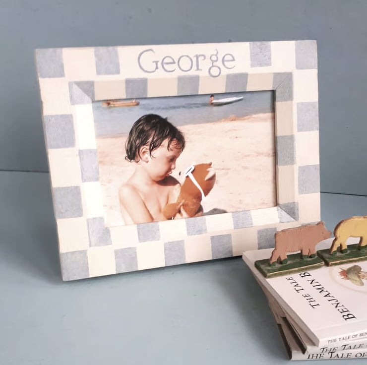 This personalised photo-frame is hand decorated with a contemporary check design. It will make a unique new born or Christening present.