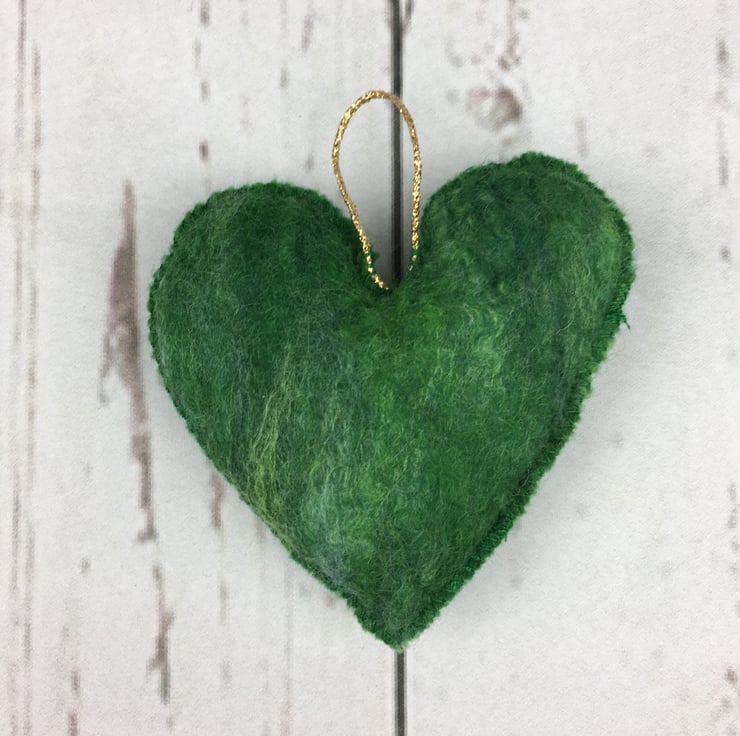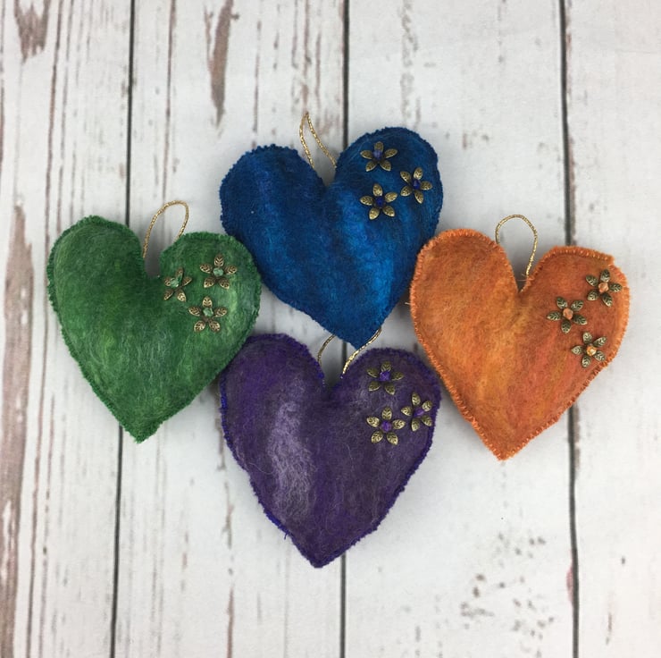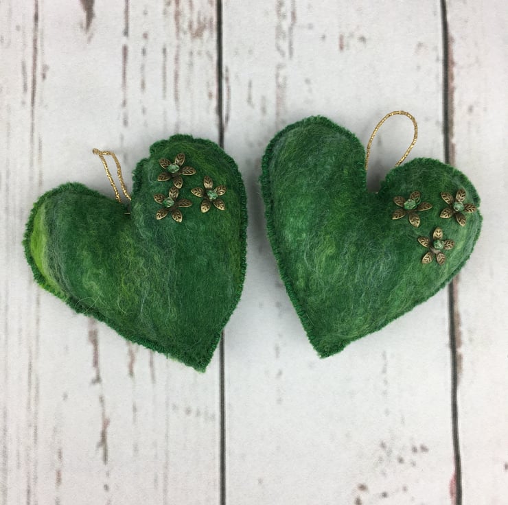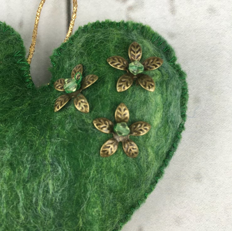 Fragranced with norfolk lavender this hanging heart has been sewn from a piece of hand made merino wool felt in green shades. It has a gold coloured cord hanging loop and three flowers with antique bronze effect petals and beaded centres.